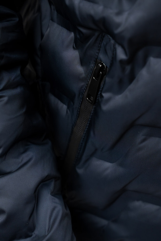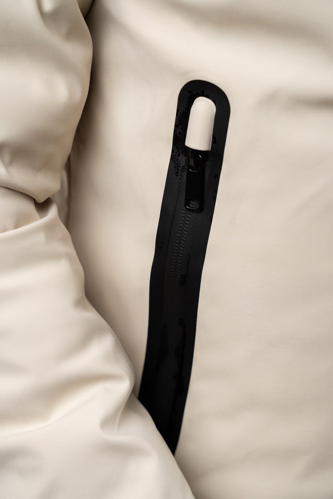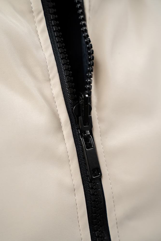 Geacă cu două fețe (crem și bleumarin) și glugă nedetașabilă. Geaca are pe ambele fețe două buzunare laterale care se închid cu fermoar.