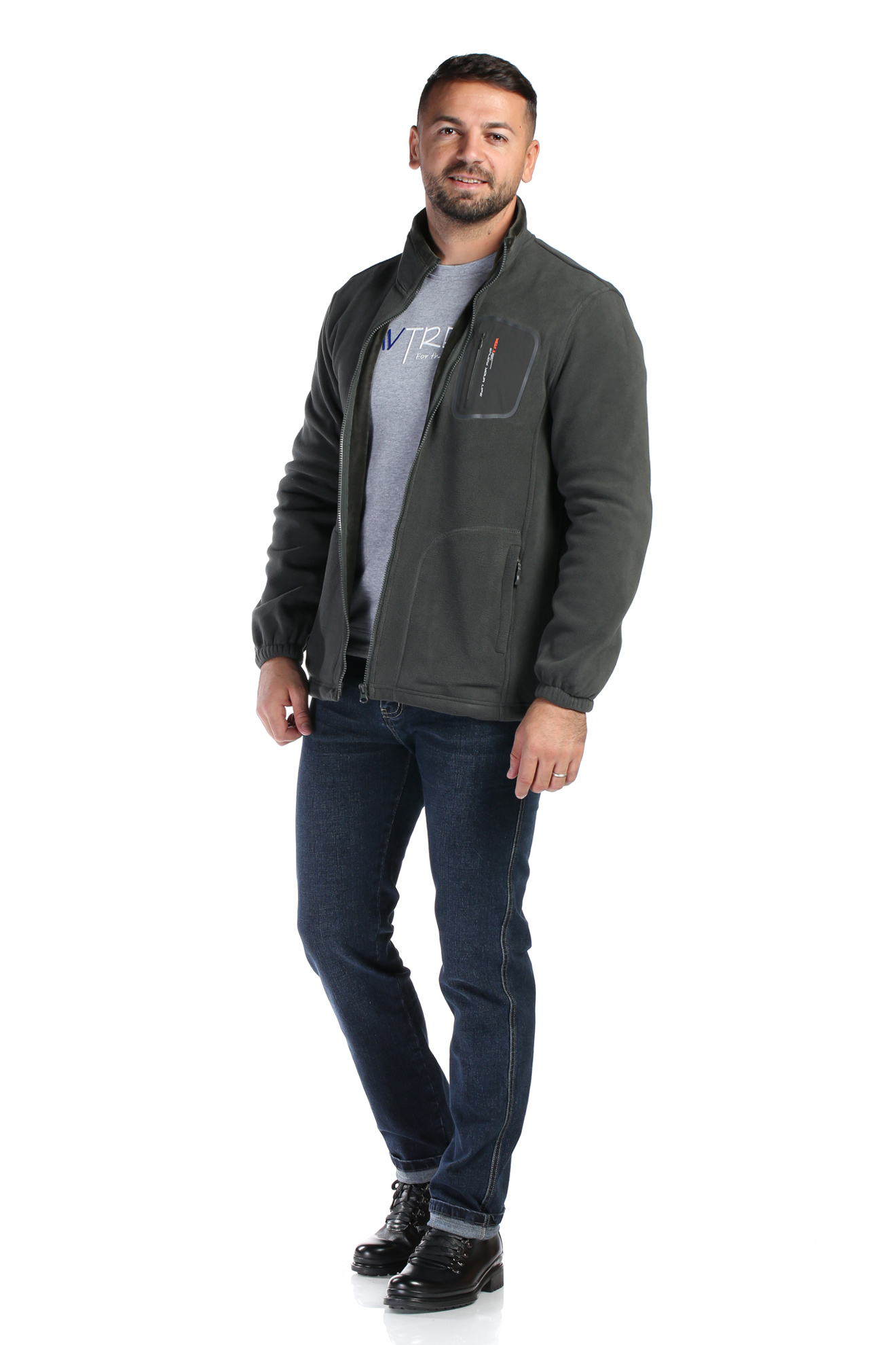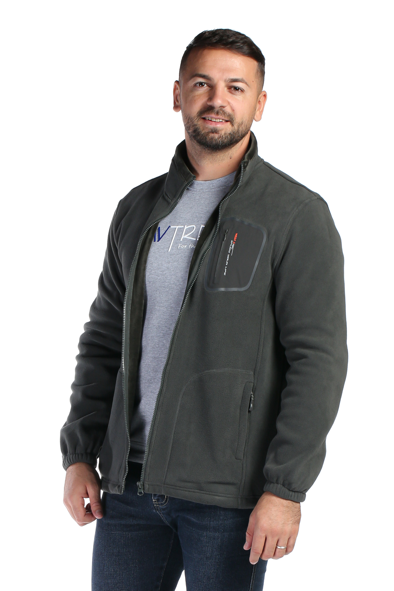 Geaca de culoare gri cu guler tunica, inchidere cu fermoar, trei buzunare cu fermoar in fata.
