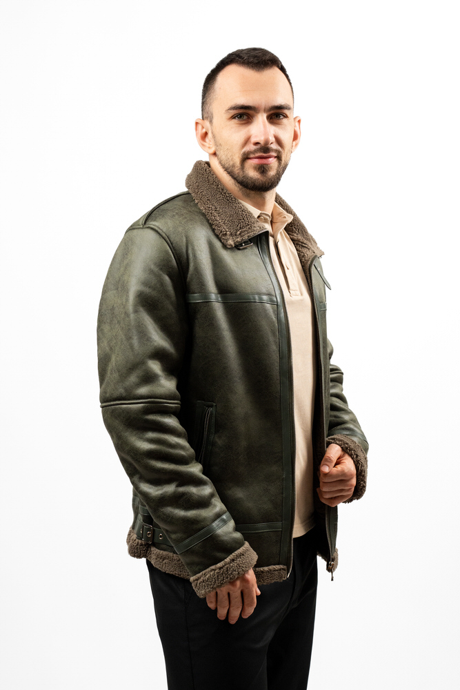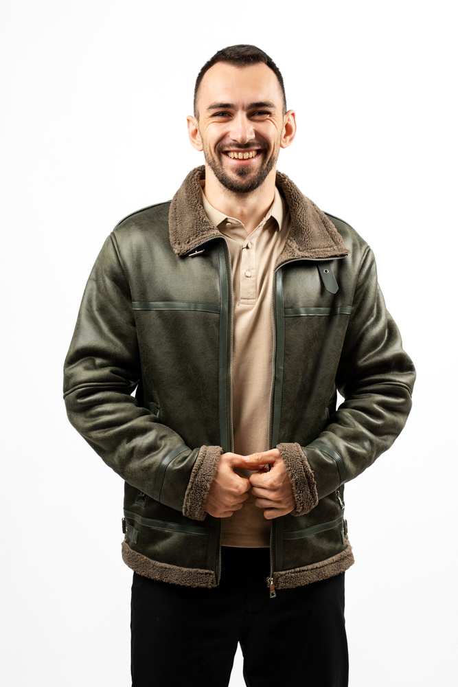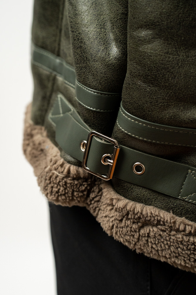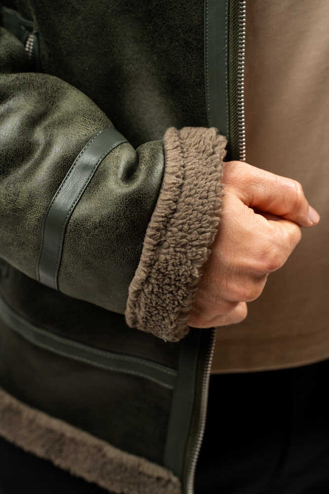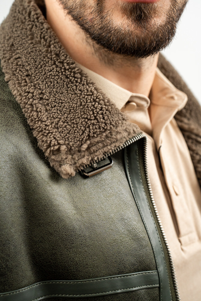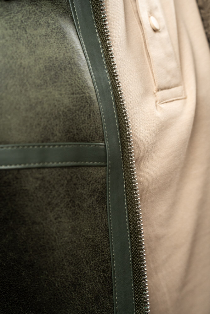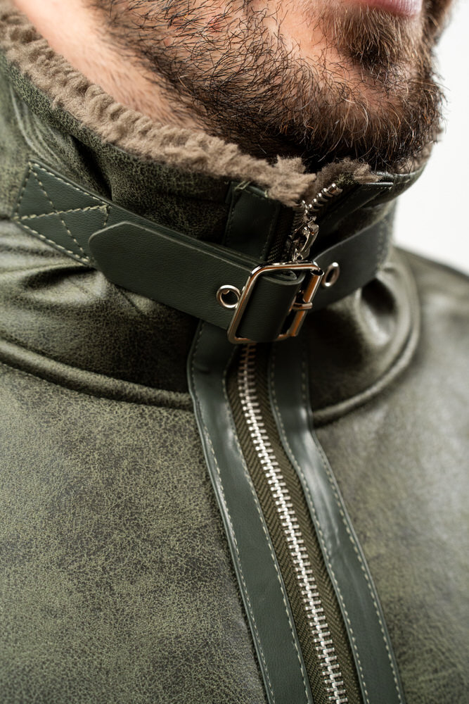 Cojoc de lungime medie cu guler tunică și închidere cu fermoar. Are două buzunare laterale care se închid cu fermoar.