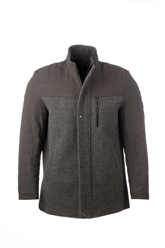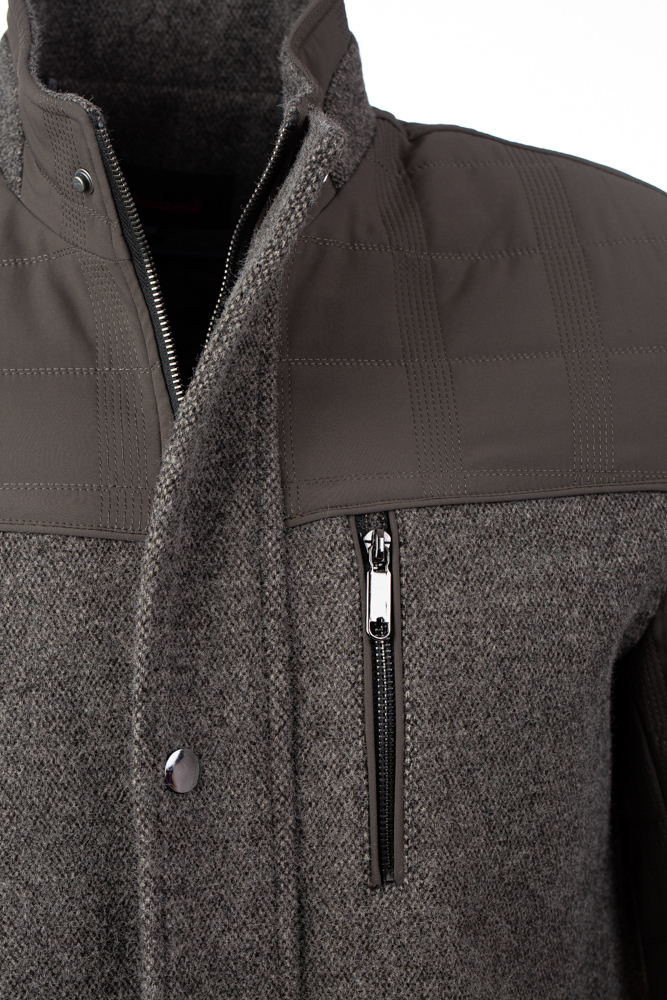 Palton de culoare maro cu guler tunică, inchidere cu fermoar și capse, trei buzunare în față și două interioare.