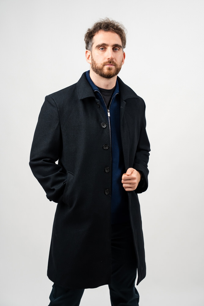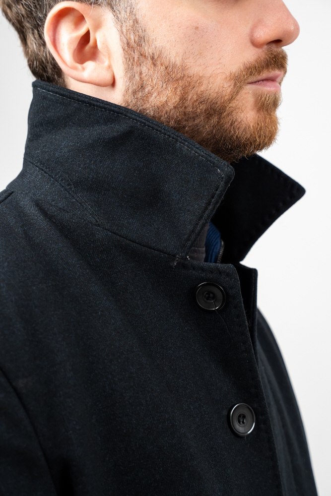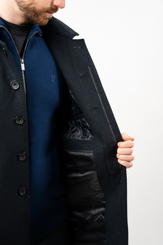 Palton lung de culoare bleumarin care se închide cu cinci nasturi. Paltonul are două buzunare laterale, două interioare și sliț la spate.