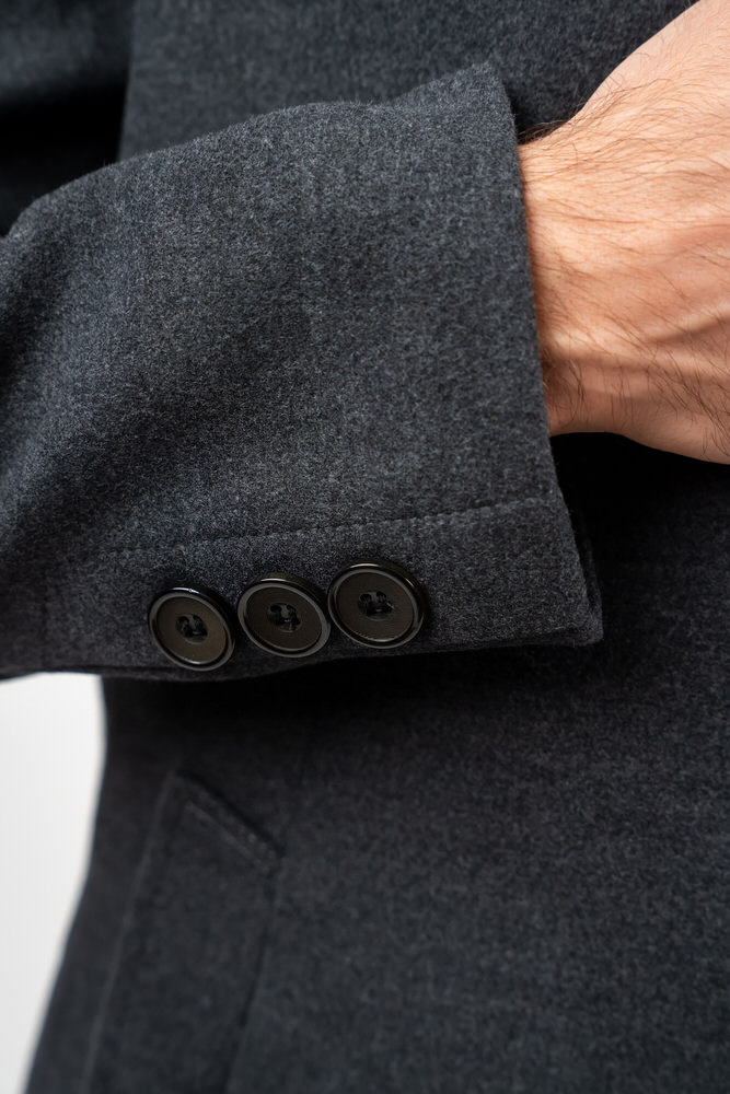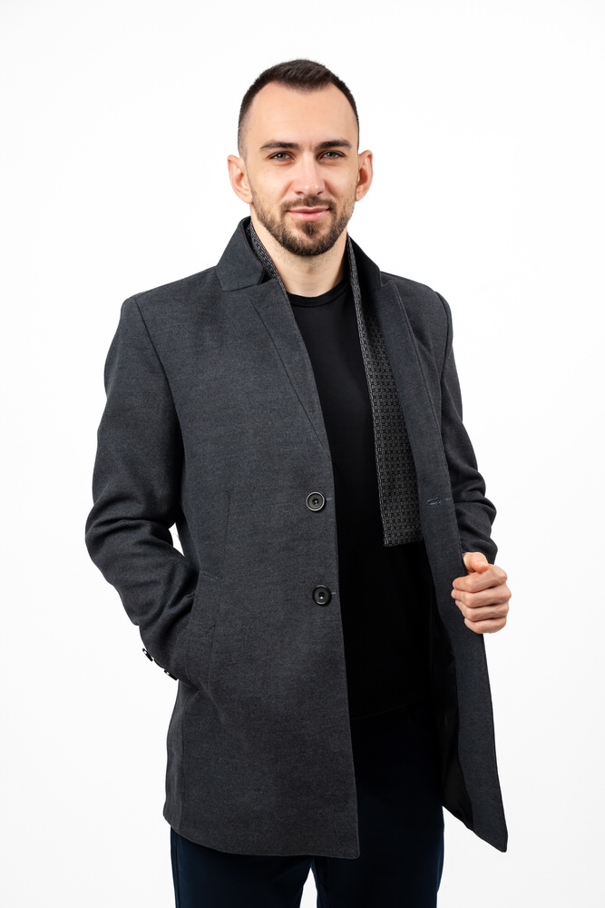 Palton de culoare gri închis cu guler rever crestat și eșarfă detașabilă. Paltonul se încheie cu doi nasturi, are două buzunare laterale, două interioare și sliț la spate.