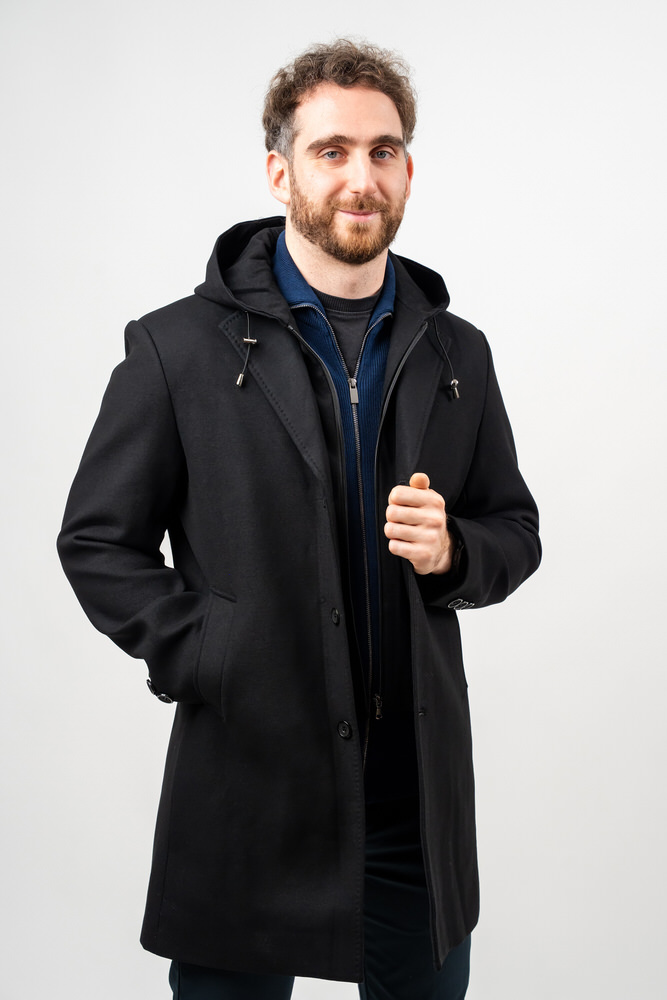 Palton lung cu guler rever și fenta cu glugă detașabilă. Paltonul se închide cu trei nasturi. Are două buzunare laterale, două interioare și sliț la spate.