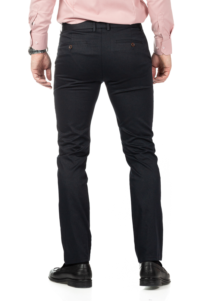 Pantaloni barbati de culoare neagra. Acesti pantaloni au o croiala slim, au patru buzunare, doua in partea din fata oblice si doua in partea din spate. Se inchid cu nasturi si fermoar si sunt realizati din 60% bumbac, 37% poliester si 3% spandex.