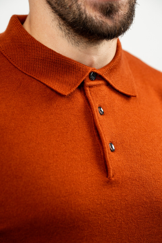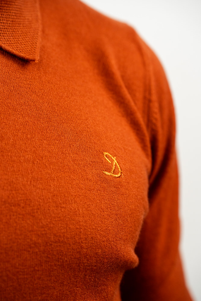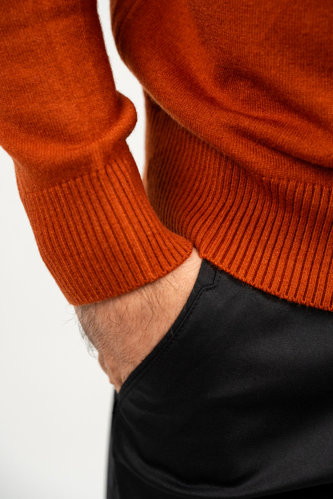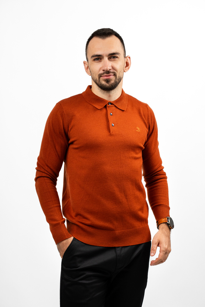 Pulover de culoare cărămiziu cu guler și fentă cu trei nasturi. Este fabricat din 10% lana 20% lyocell și 70% vâscoză.