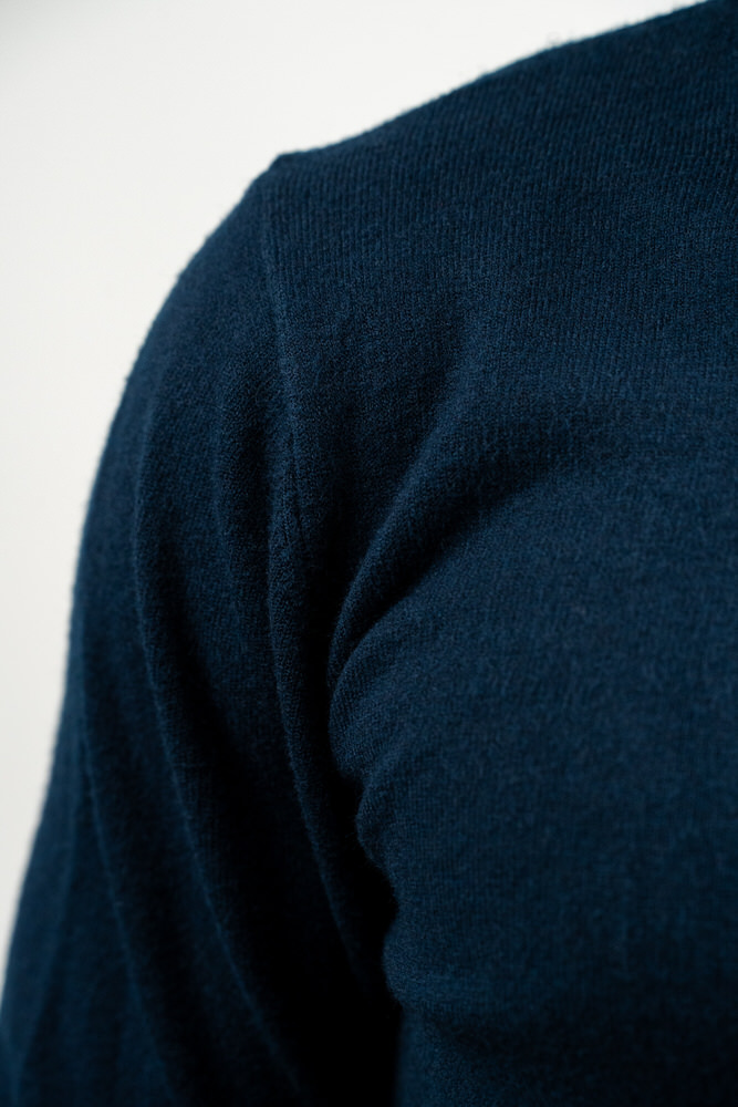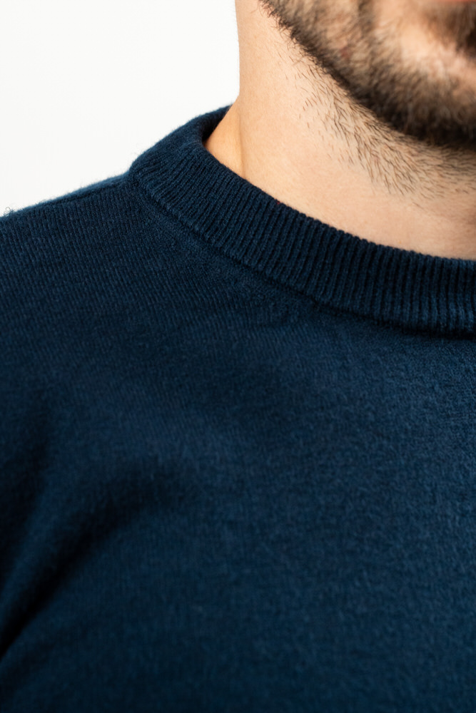 Pulover cu guler rotund. Este fabricat din 10% lână 20% lyocell și 70% vâscoză.