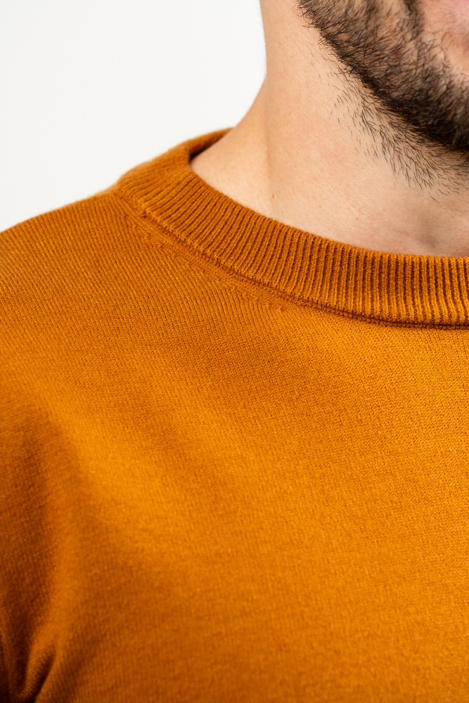 Pulover cu guler rotund. Este fabricat din 10% lână 20% lyocell și 70% vâscoză.
