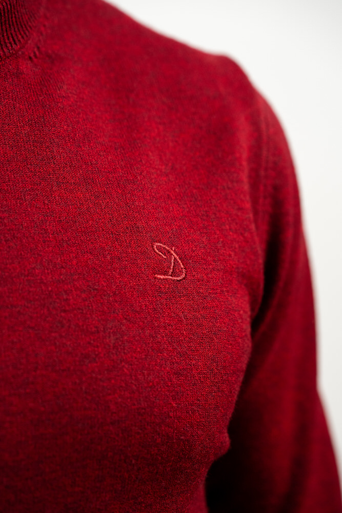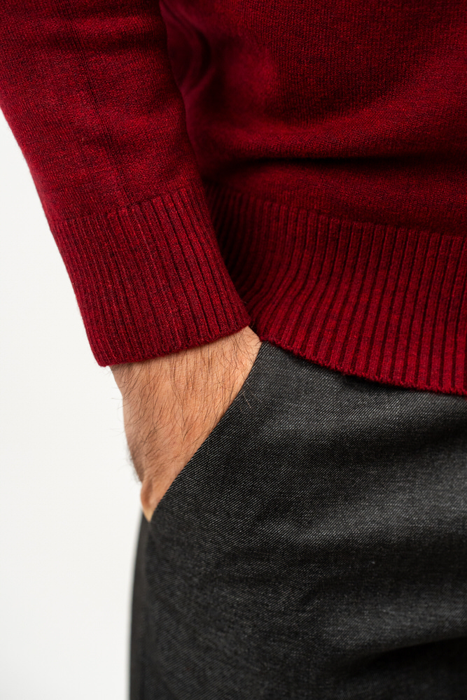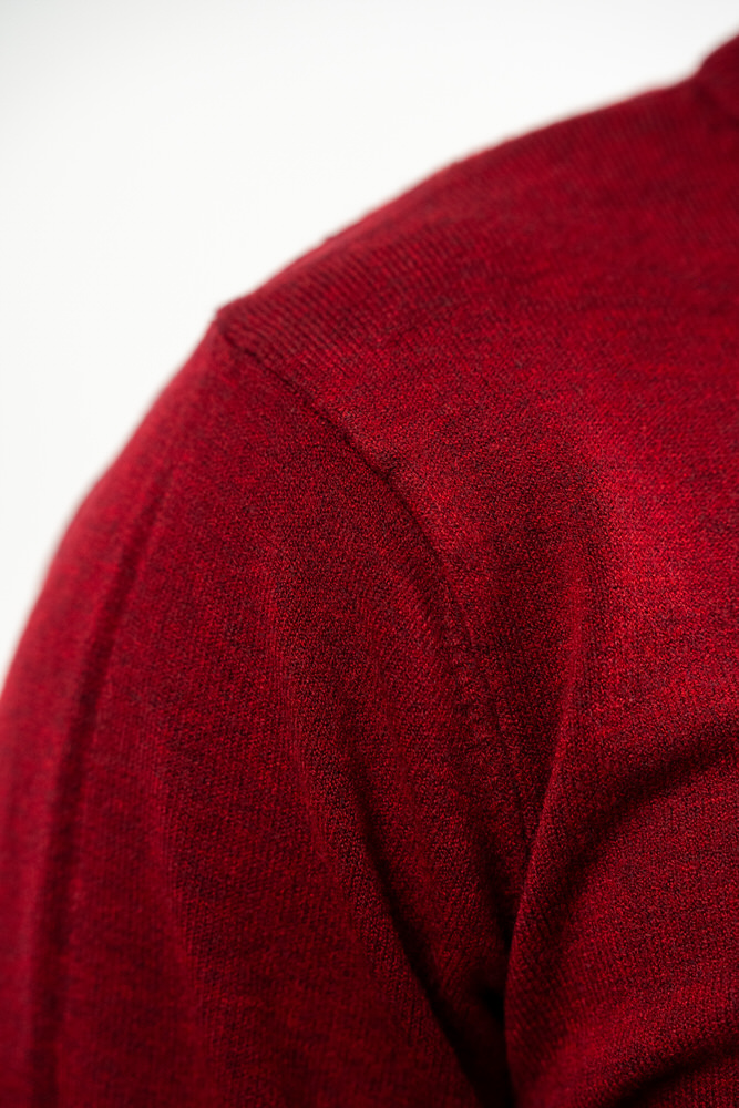Pulover cu guler rotund. Este fabricat din 10% lână 20% lyocell și 70% vâscoză.