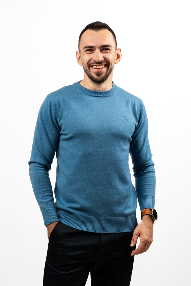 Pulover de culoare albastru canar cu guler rotund. Este fabricat din 10% lână 20% lyocell și 70% vâscoză.