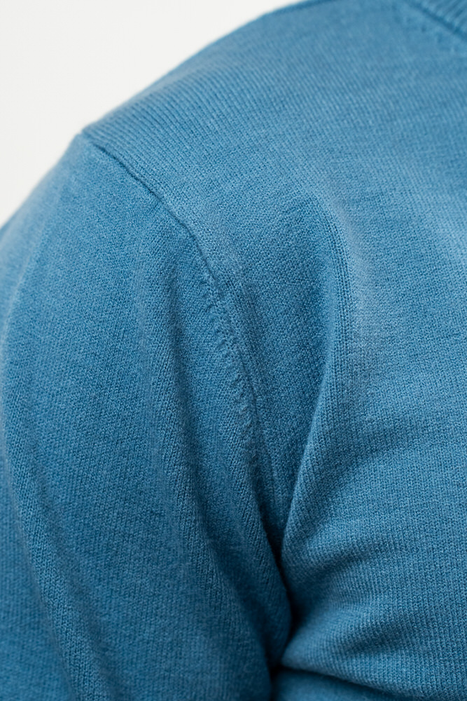 Pulover cu guler rotund. Este fabricat din 10% lână 20% lyocell și 70% vâscoză.