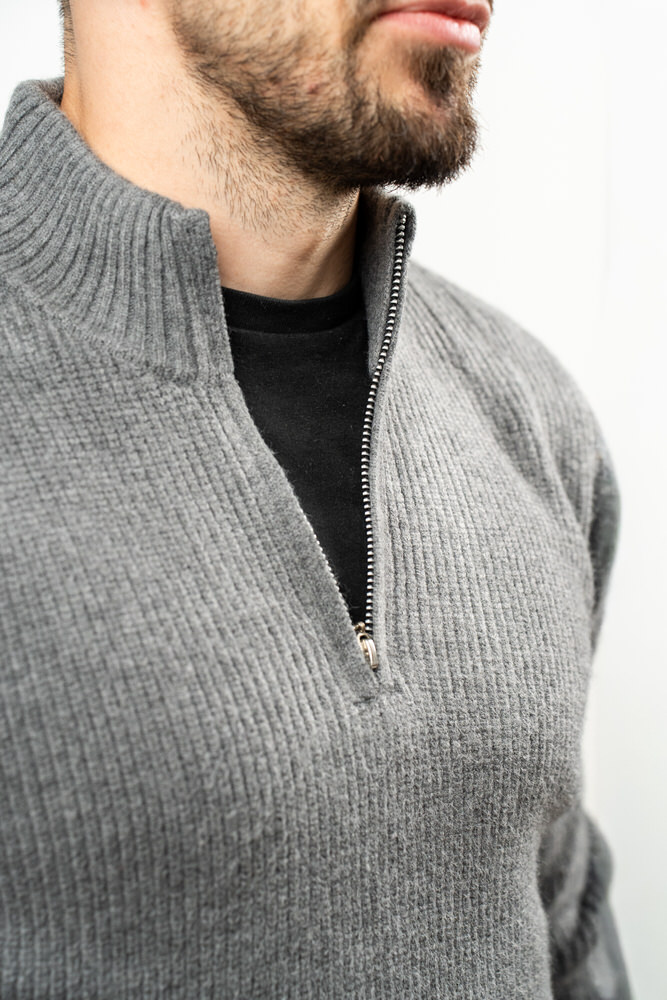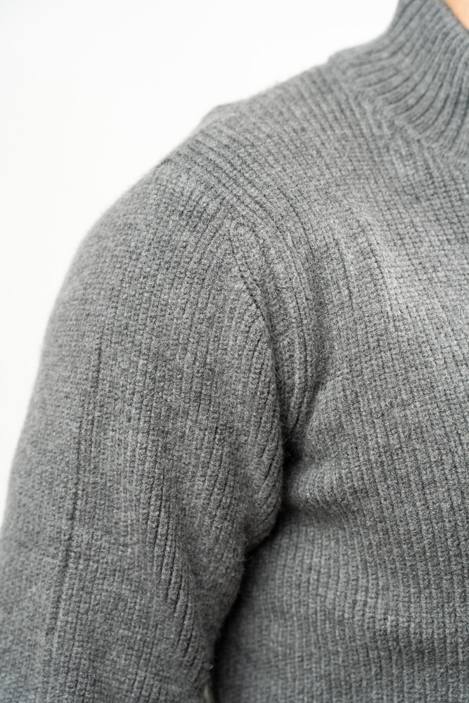 Pulover cu guler pe gât și fermoar. Este fabricat din 10% lână 20% lyocell și 70% vâscoză.