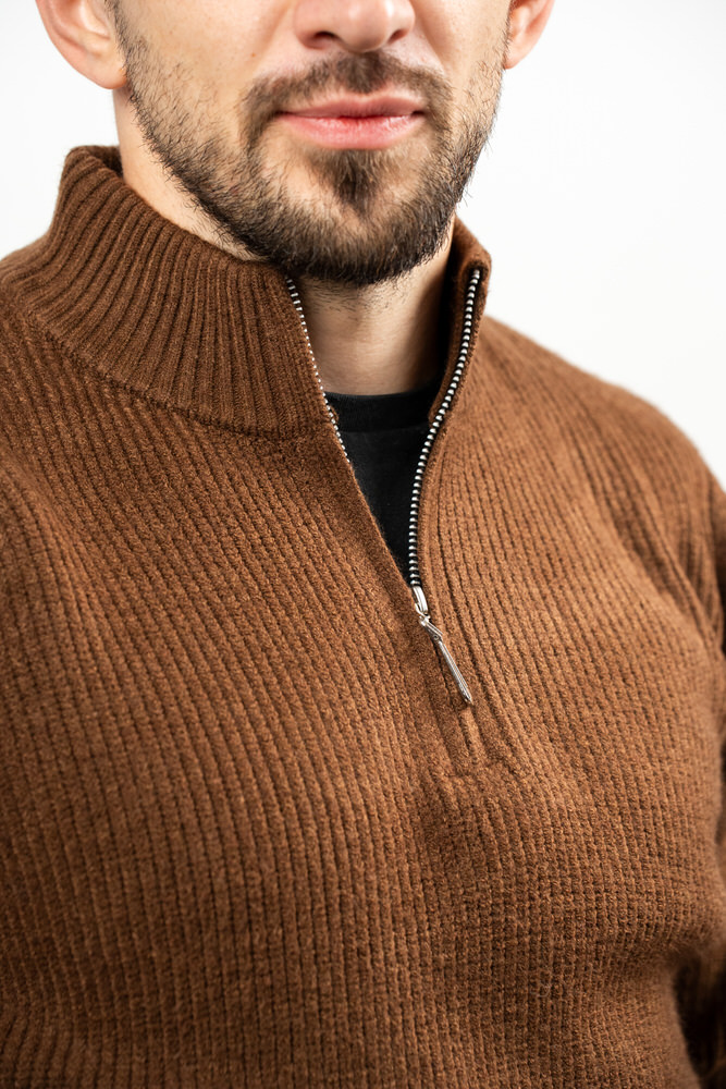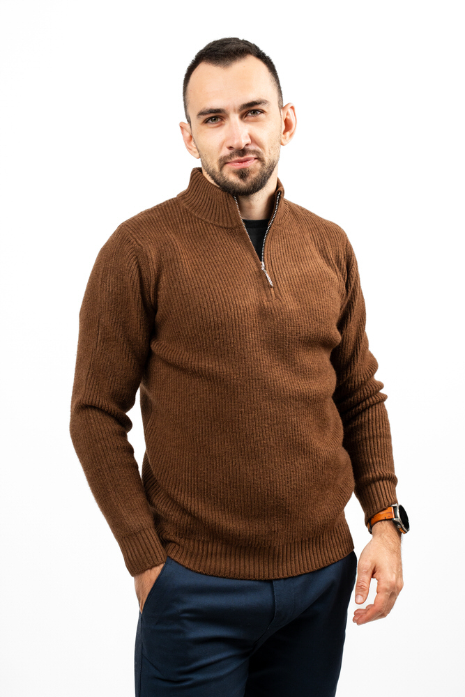 Pulover cu guler pe gât și fermoar. Este fabricat din 10% lână 20% lyocell și 70% vâscoză.
