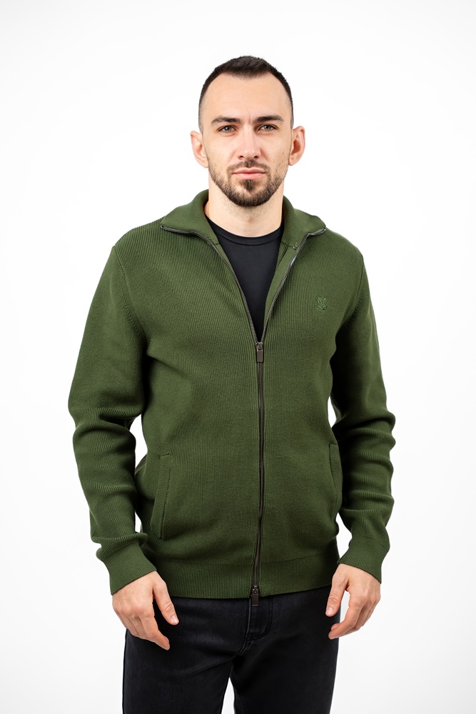 Pulover de culoare verde spanac cu guler pe gât și fermoar lung. Este fabricat din 50% bumbac 50% vâscoză.