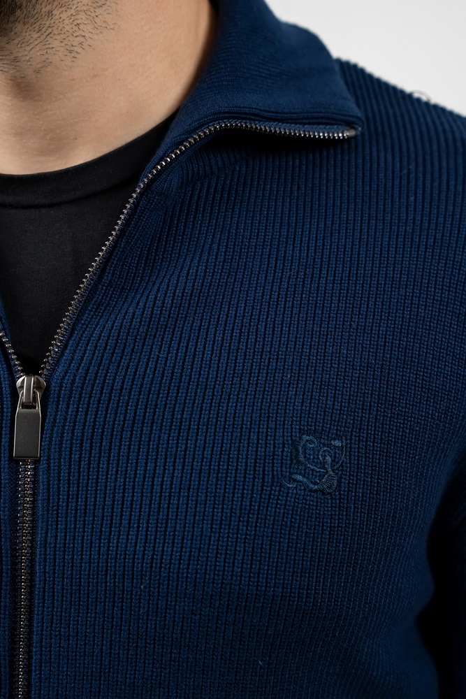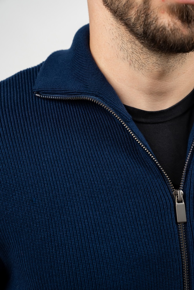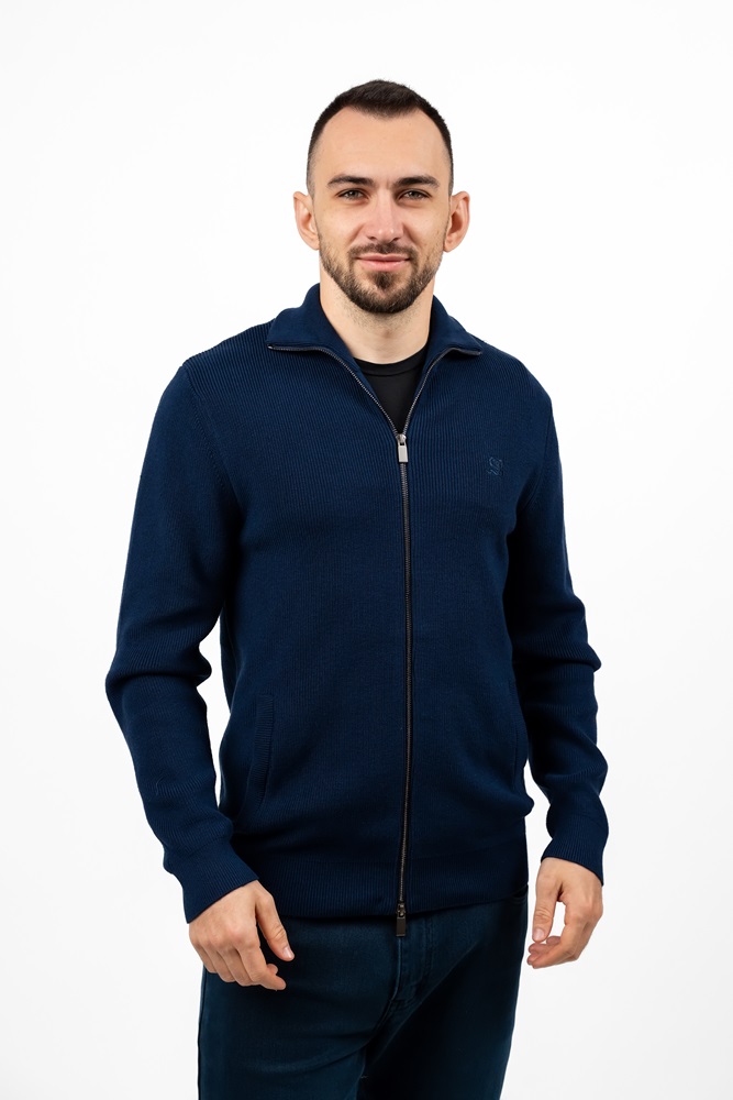 Pulover de culoare indigo închis cu guler pe gât și fermoar lung. Este fabricat din 50% bumbac 50% vâscoză.