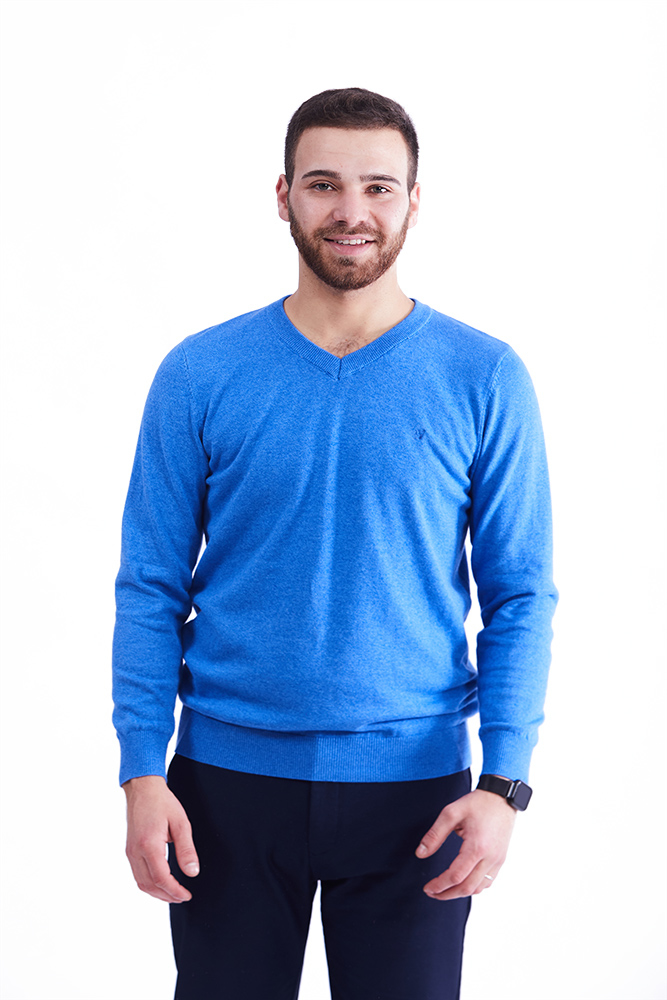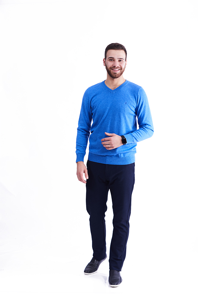 Puloverul albastru, cu decolteul în V, este o piesă vestimentară perfectă pentru temperaturile răcoroase.