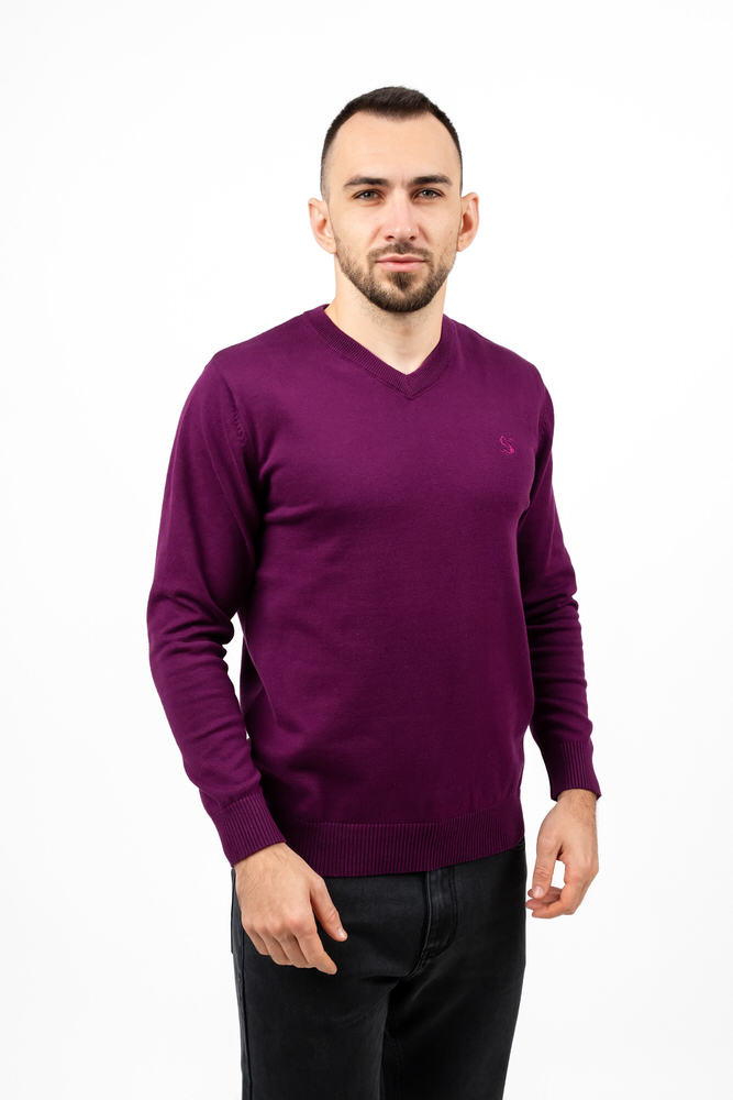 Pulover de culoare purpura cu guler în V. Este fabricat din 98% bumbac 2% poliester.