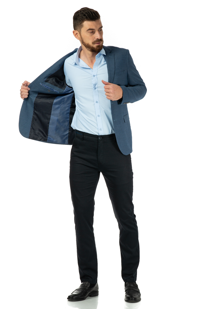 Sacou barbati albastru. Aceasta piesa vestimentara este confectionata din 20% lana, 40% poliester si 40% vascoza. Sacoul are croi slim cu guler rever,doua buzunare cu clapa,unul pentru batista,doua buzunare interioare si un slit la spate.