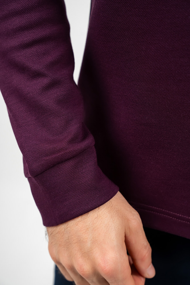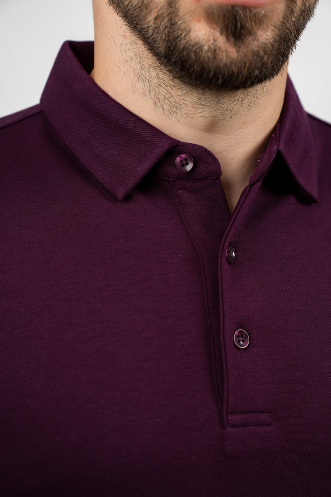 Tricou de culoare coacăză neagră, cu mânecă lungă tip polo și fenta cu trei nasturi.