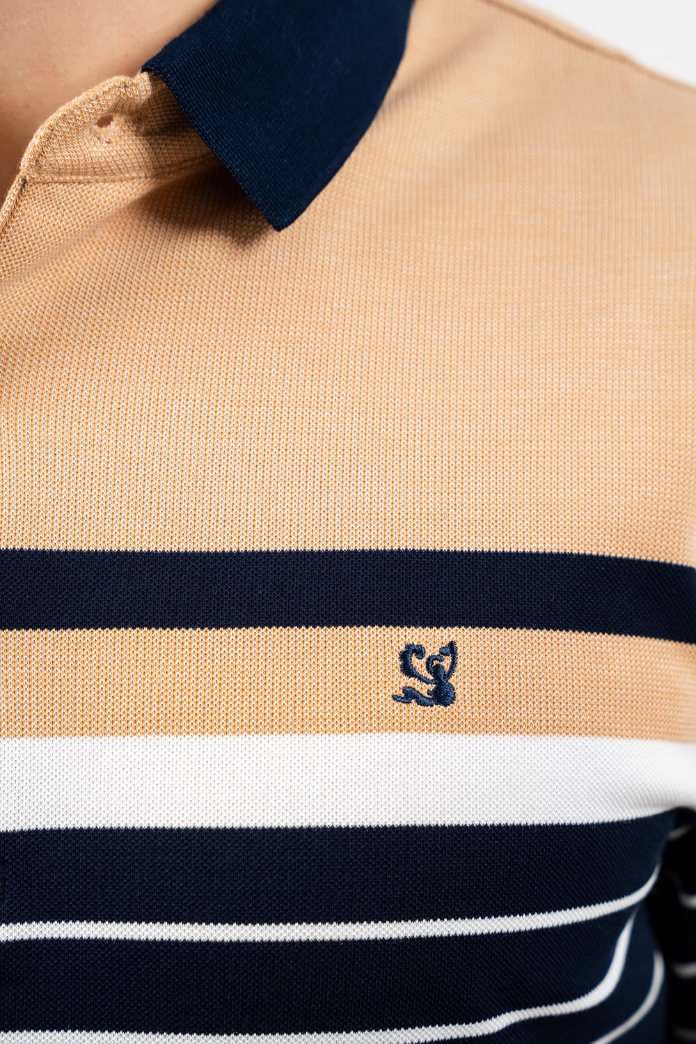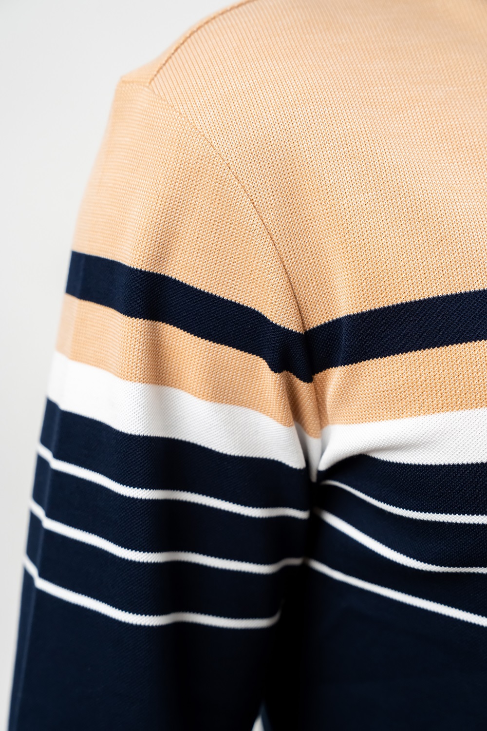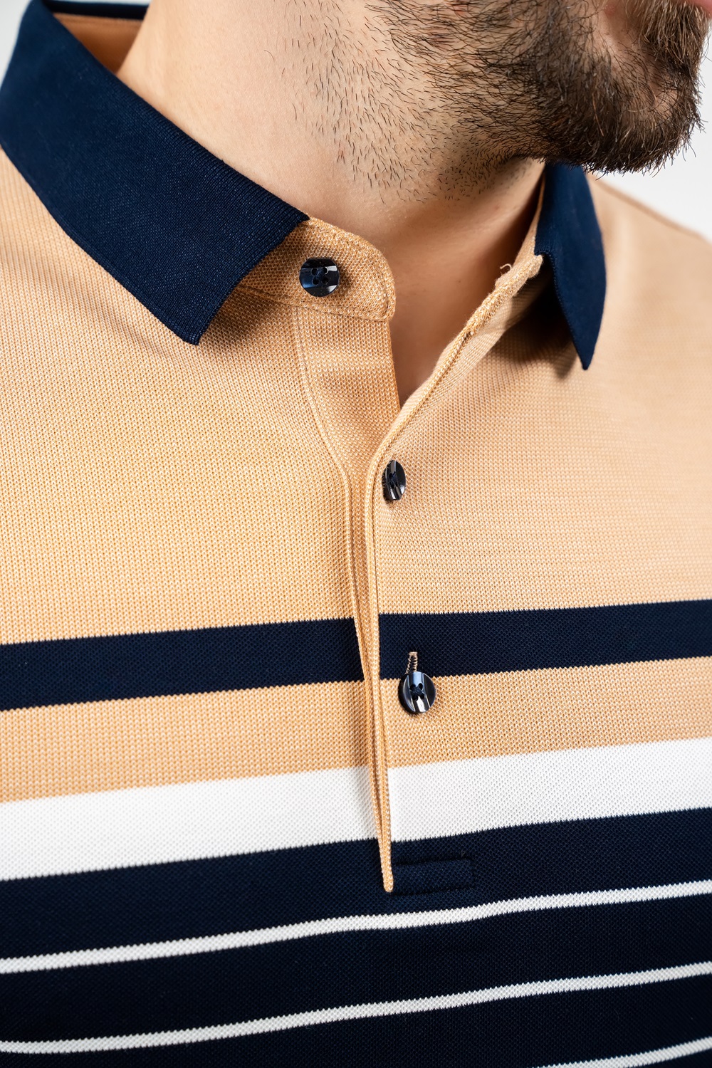 Tricou de culoare bleumarin cu dungi albe și bej, cu mânecă lungă tip polo cu guler reiat și fenta cu trei nasturi.
