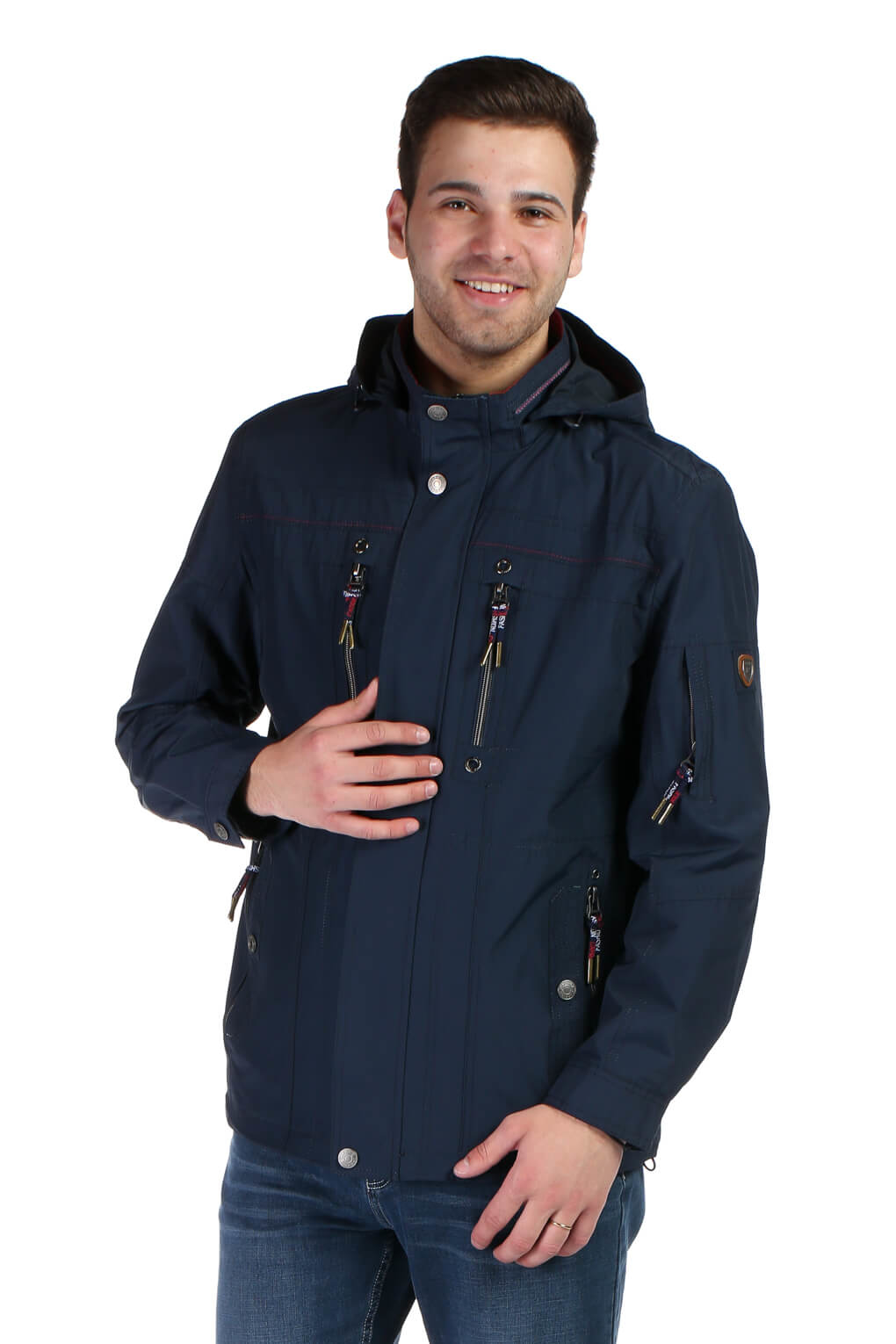 Geaca bărbătească bleumarin este confecționată din bumbac 45% și poliester 55%. Acest articol vestimentar se diversifică prin gulerul tip tunică, închidere pe bază de fermoar, glugă detașabilă, 3 buzunare interioare și 6 buzunare in față. Modelul gecii este realizat după un croi regular și un stil classic. Este un articol vestimentar ce poate fi adaptat ținutelor casual de primăvară.
