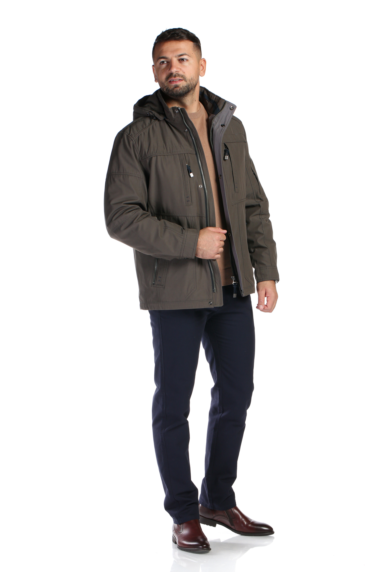 Geaca de culoare maro cu guler tunica, inchidere cu fermoar, patru buzunare cu fermoar in fata, doua buzunare interioare, gluga si un interior detasabil.