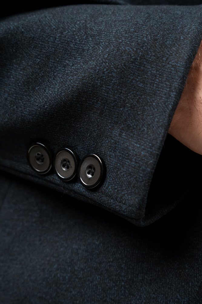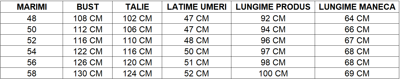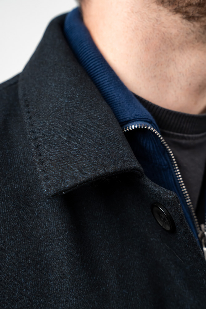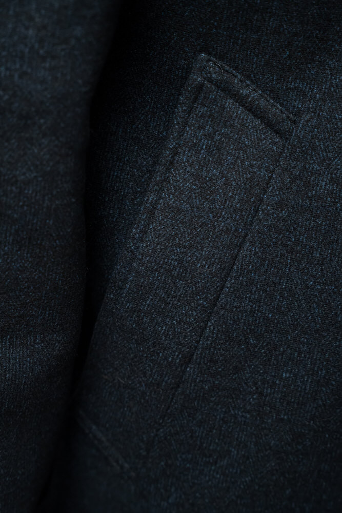 Palton lung de culoare bleumarin care se închide cu cinci nasturi. Paltonul are două buzunare laterale, două interioare și sliț la spate.