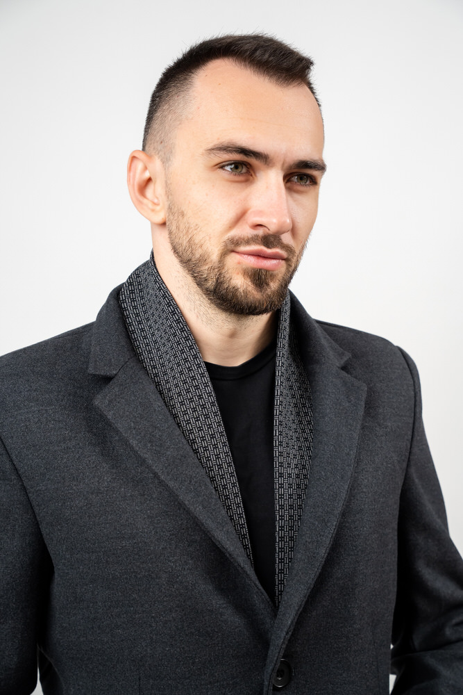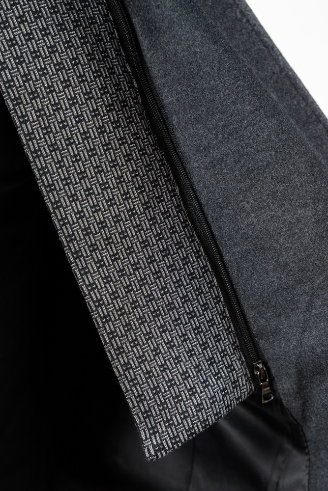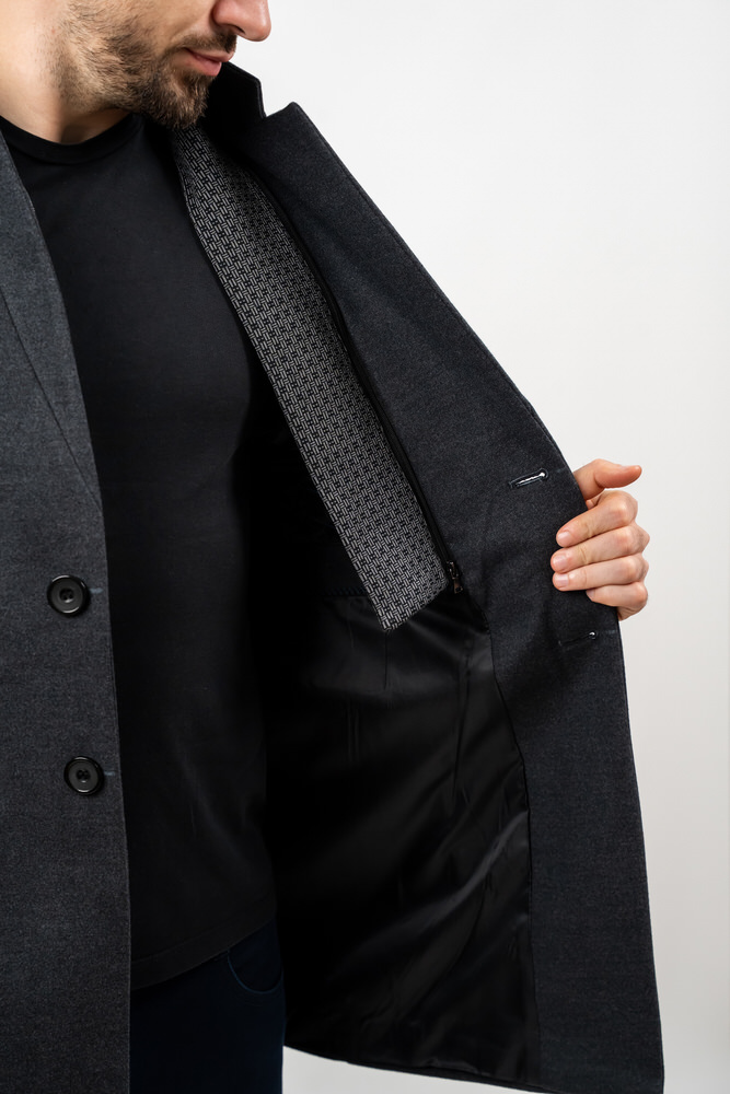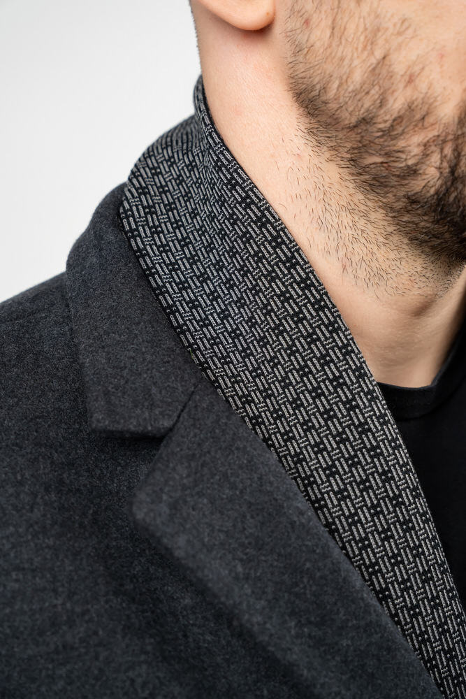 Palton de culoare gri închis cu guler rever crestat și eșarfă detașabilă. Paltonul se încheie cu doi nasturi, are două buzunare laterale, două interioare și sliț la spate.