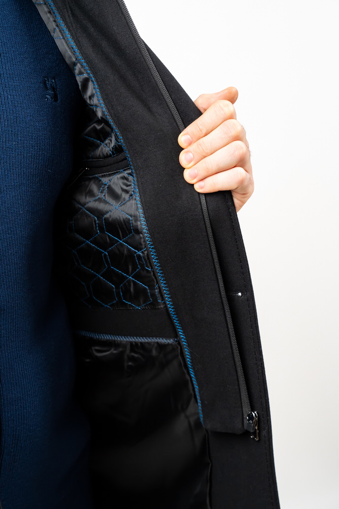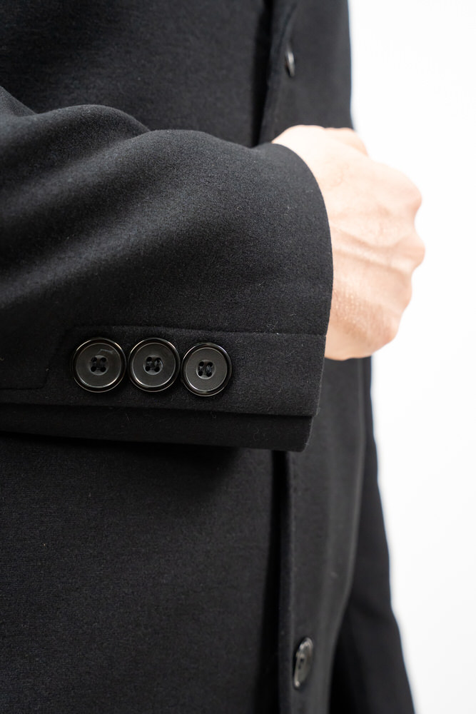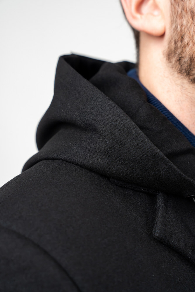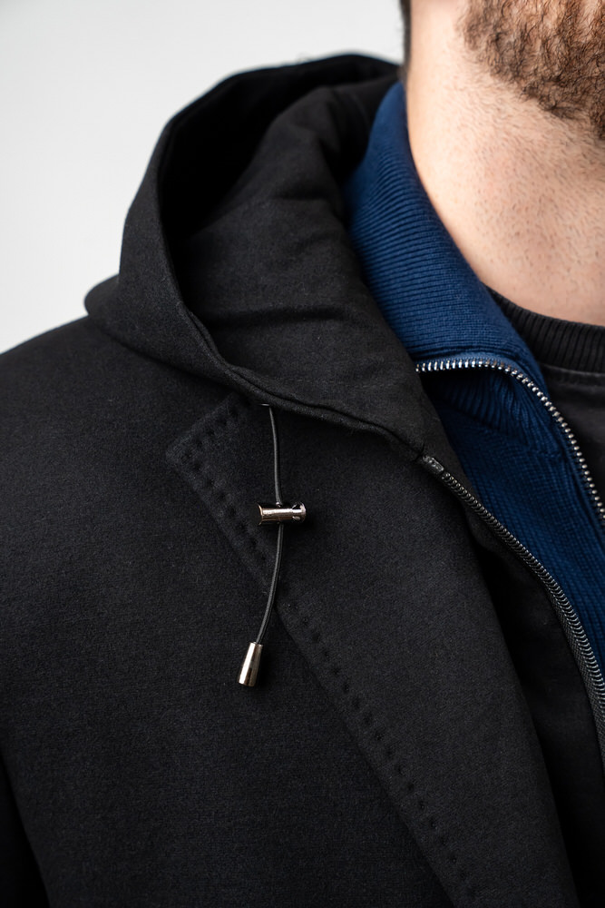 Palton lung cu guler rever și fenta cu glugă detașabilă. Paltonul se închide cu trei nasturi. Are două buzunare laterale, două interioare și sliț la spate.