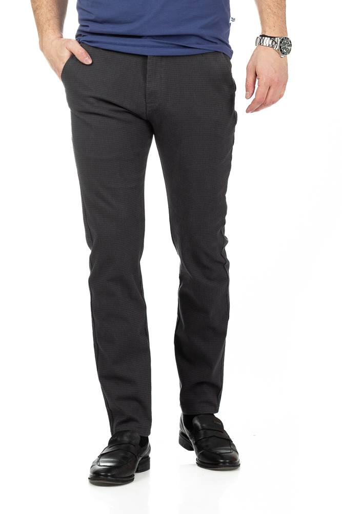 Pantaloni barbati de culoare gri. Acesti pantaloni au o croiala regular, au patru buzunare, doua in partea din fata oblice si doua in partea din spate. Se inchid cu nasturi si fermoar si sunt realizati din 65% bumbac, 33% poliester si 2% spandex.