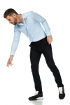 Pantaloni barbati de culoare neagră. Acești pantaloni au o croială slim.