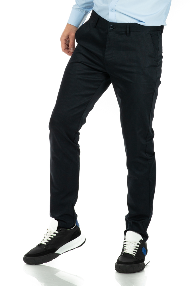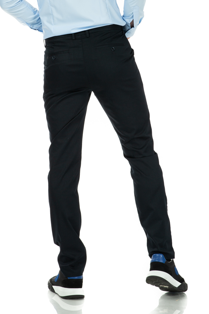 Pantaloni barbati de culoare neagră. Acești pantaloni au o croială slim.