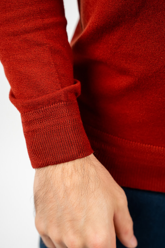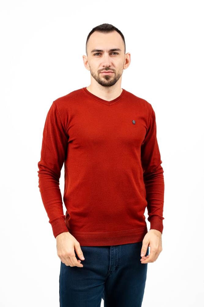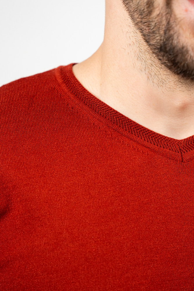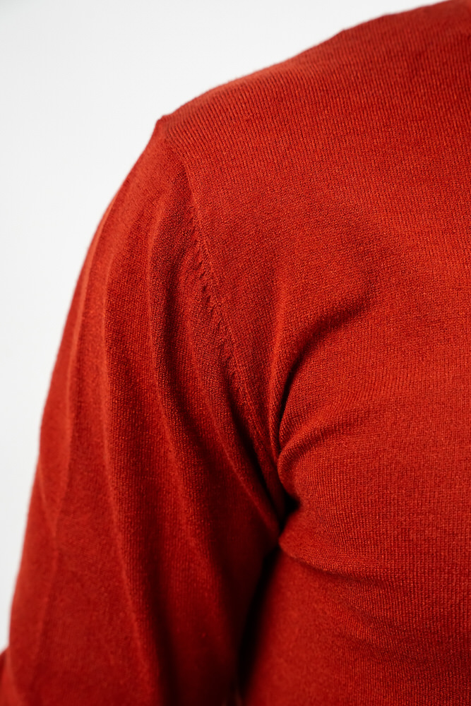 Pulover de culoare cărămizie cu guler în V. Este fabricat din 80% vâscoză 20% poliester.