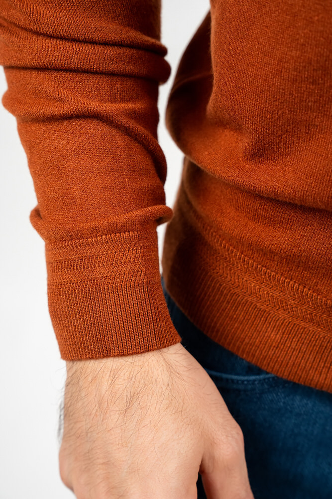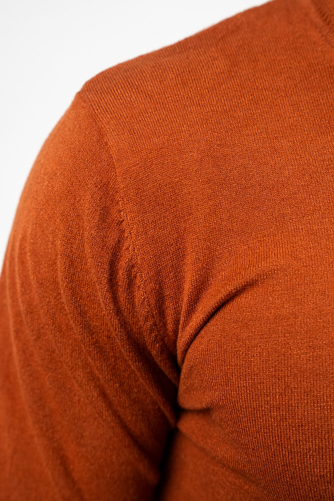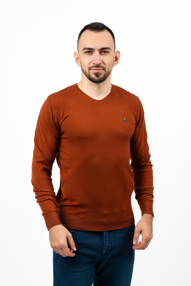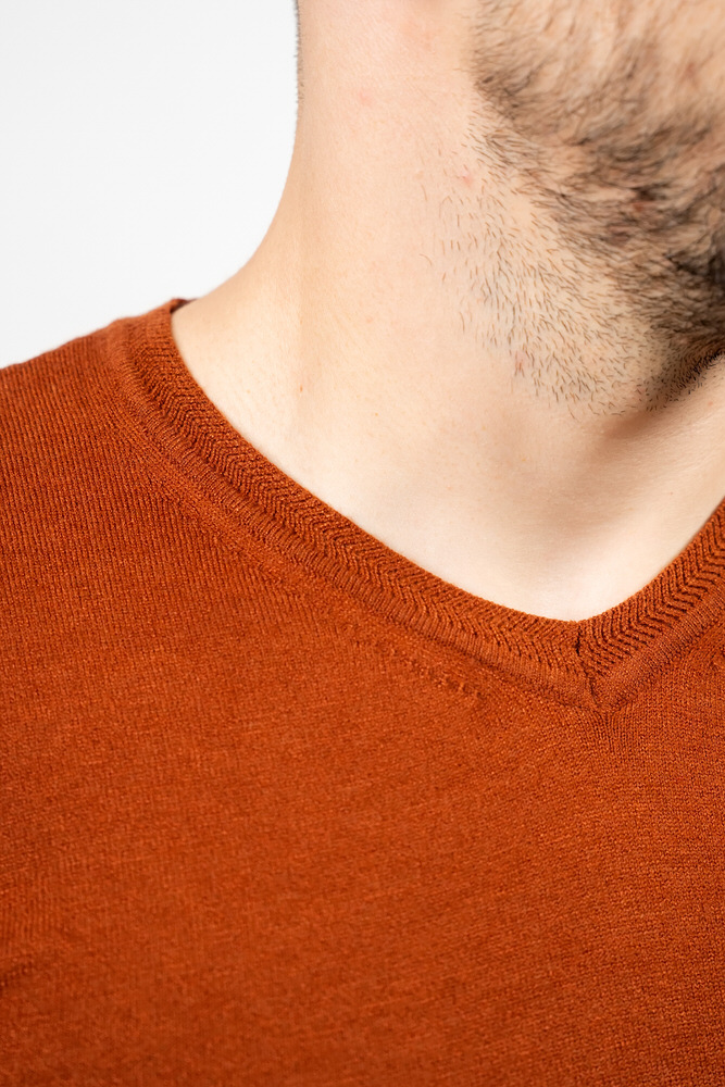 Pulover de culoare maro ruginiu cu guler în V. Este fabricat din 80% vâscoză 20% poliester.