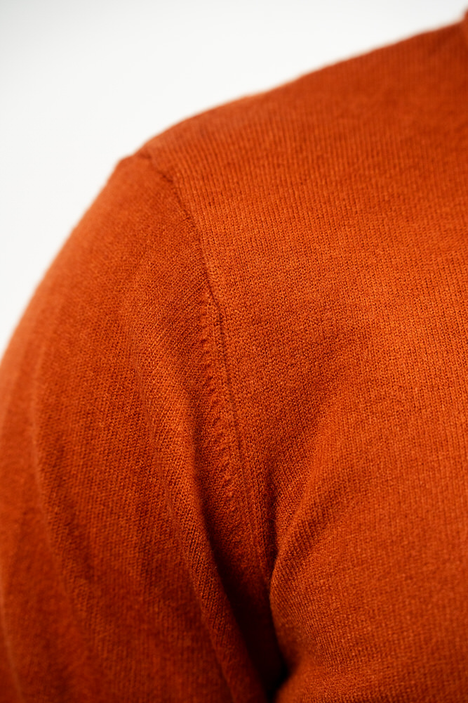 Pulover cu guler și fentă cu trei nasturi. Este fabricat din 10% lana 20% lyocell și 70% vâscoză.