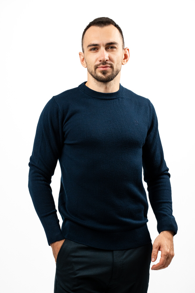 Pulover de culoare bleumarin cu guler rotund. Este fabricat din 10% lână 20% lyocell și 70% vâscoză.