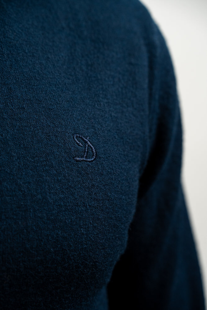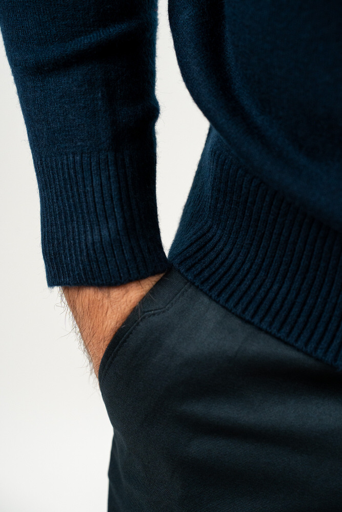 Pulover cu guler rotund. Este fabricat din 10% lână 20% lyocell și 70% vâscoză.
