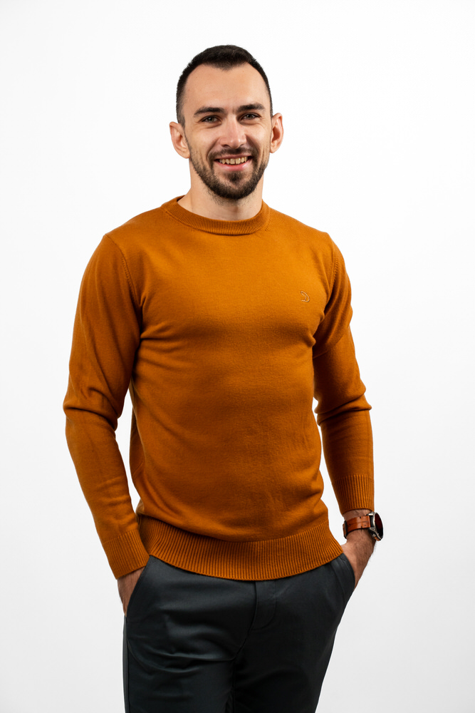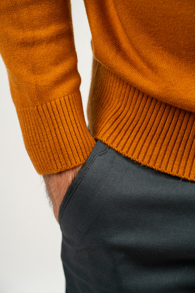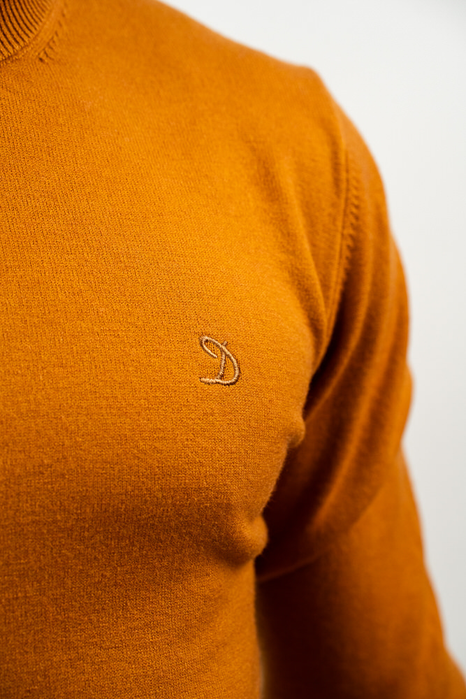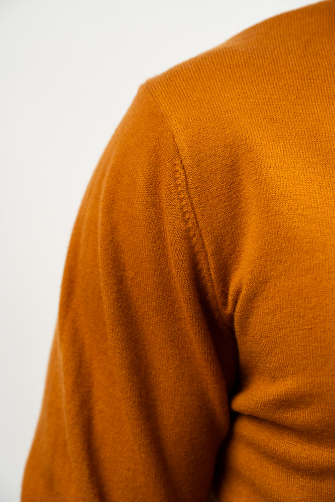 Pulover cu guler rotund. Este fabricat din 10% lână 20% lyocell și 70% vâscoză.