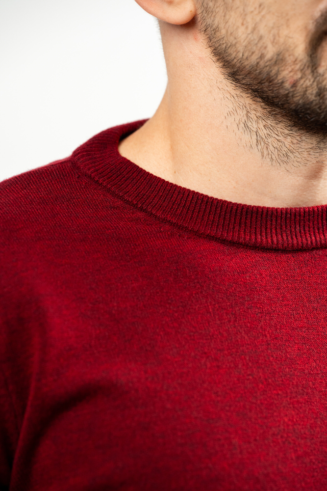 Pulover cu guler rotund. Este fabricat din 10% lână 20% lyocell și 70% vâscoză.