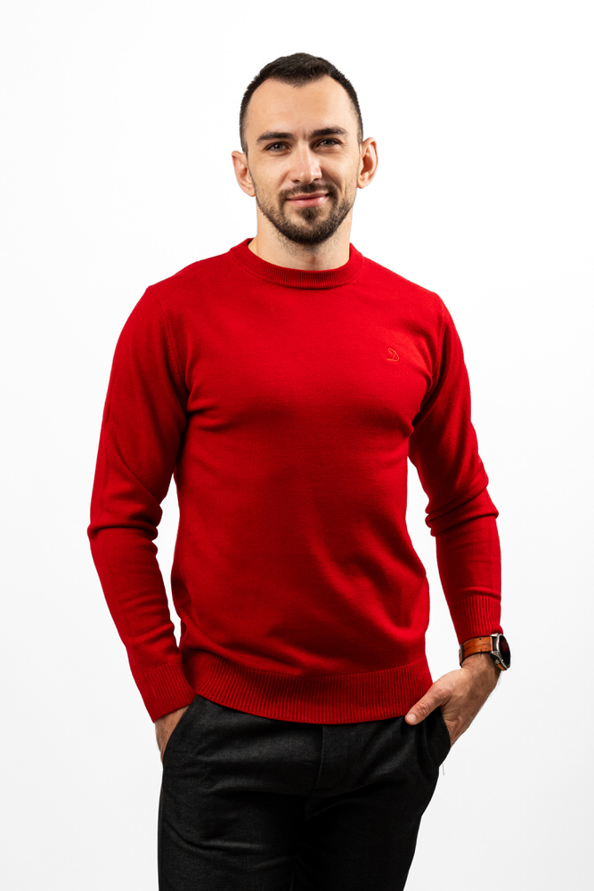 Pulover de culoare roșie cu guler rotund. Este fabricat din 10% lână 20% lyocell și 70% vâscoză.