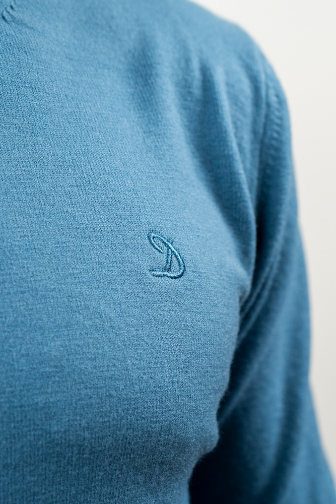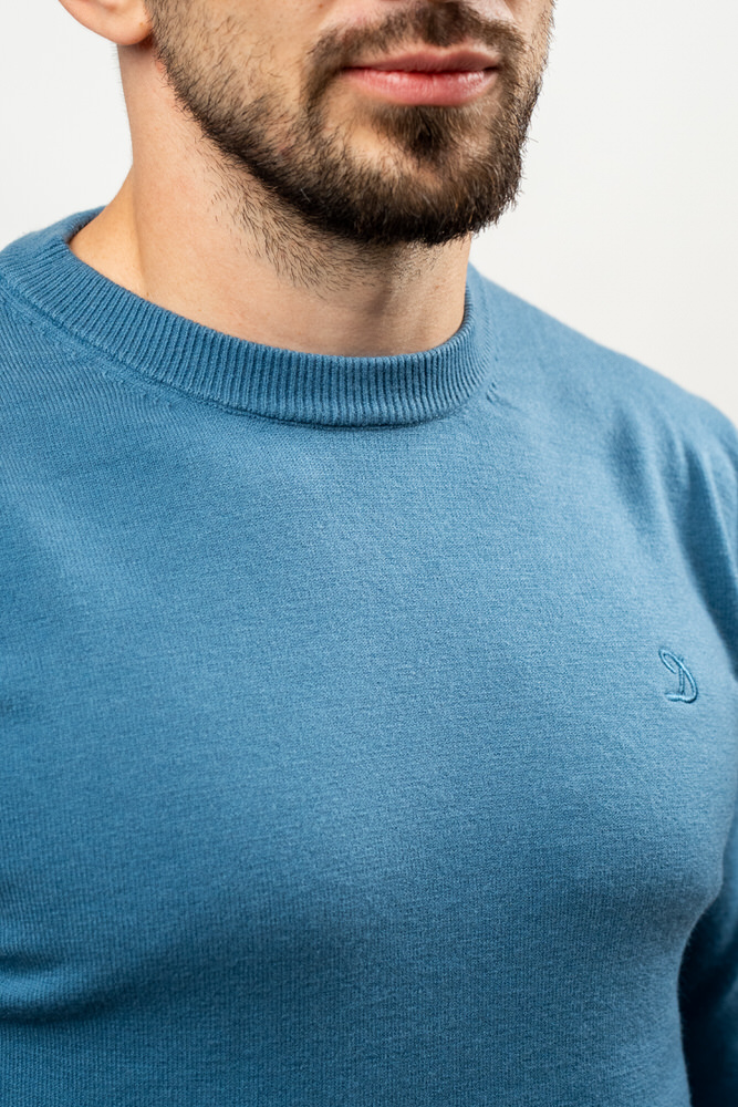 Pulover cu guler rotund. Este fabricat din 10% lână 20% lyocell și 70% vâscoză.