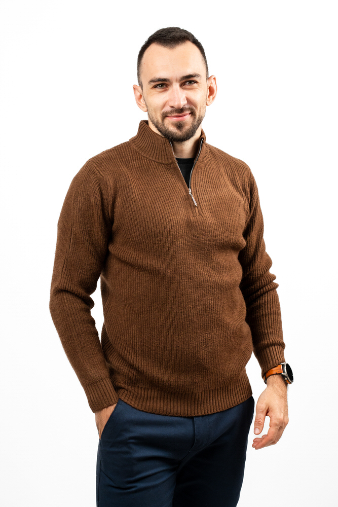 Pulover de culoare maro cu guler pe gât și fermoar. Este fabricat din 10% lână 20% lyocell și 70% vâscoză.