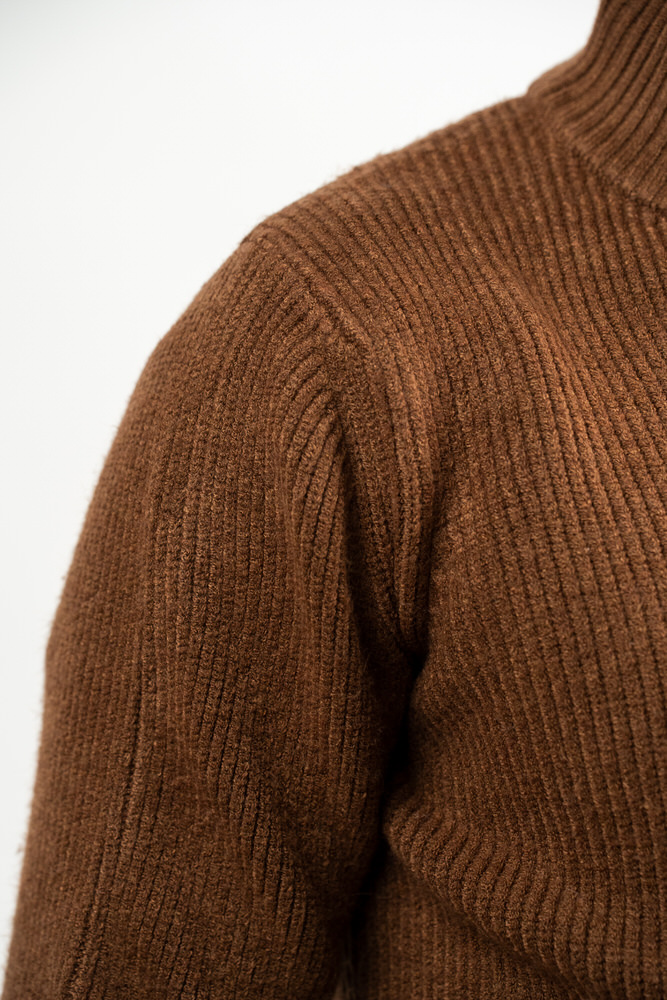Pulover cu guler pe gât și fermoar. Este fabricat din 10% lână 20% lyocell și 70% vâscoză.