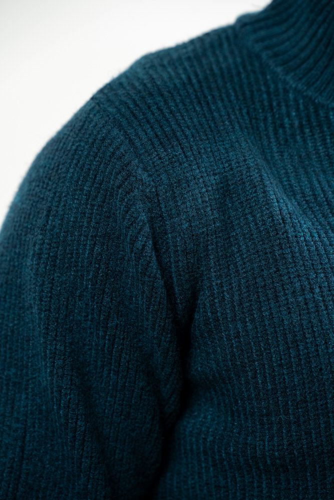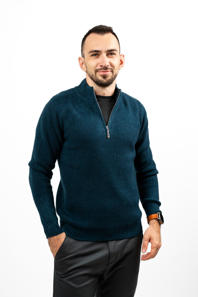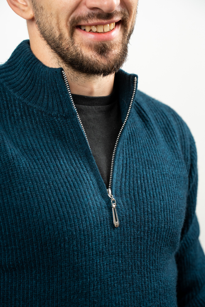 Pulover cu guler pe gât și fermoar. Este fabricat din 10% lână 20% lyocell și 70% vâscoză.