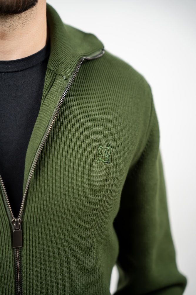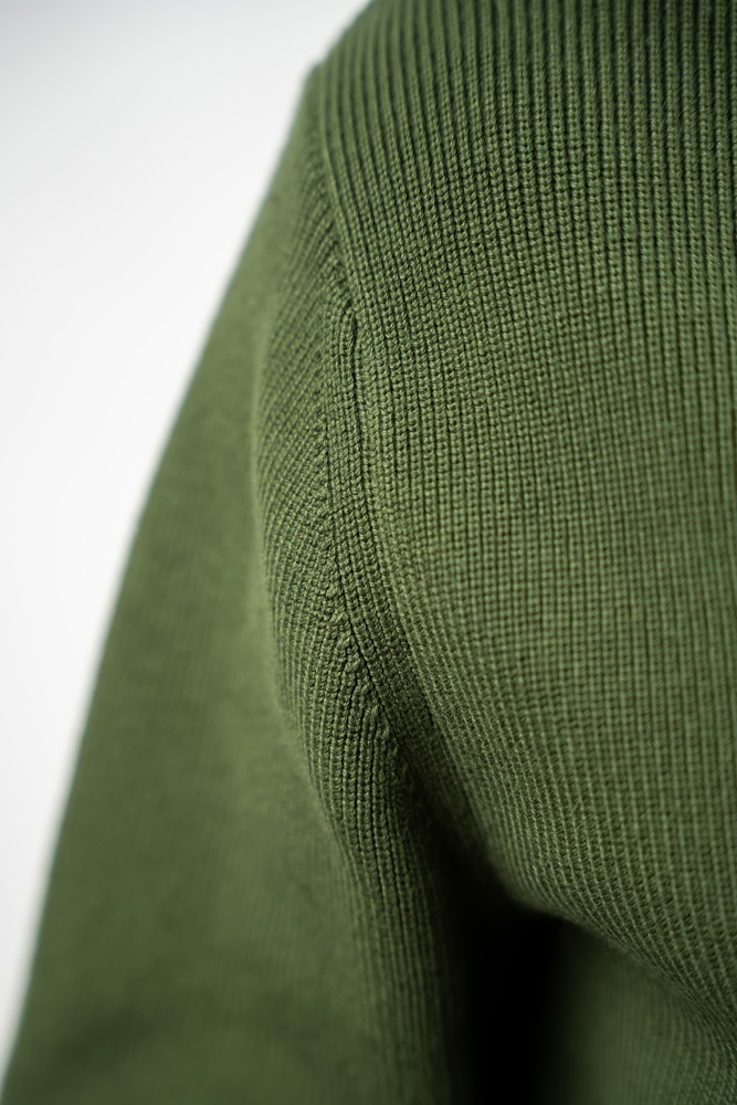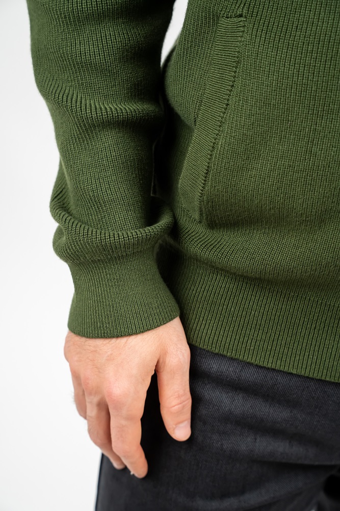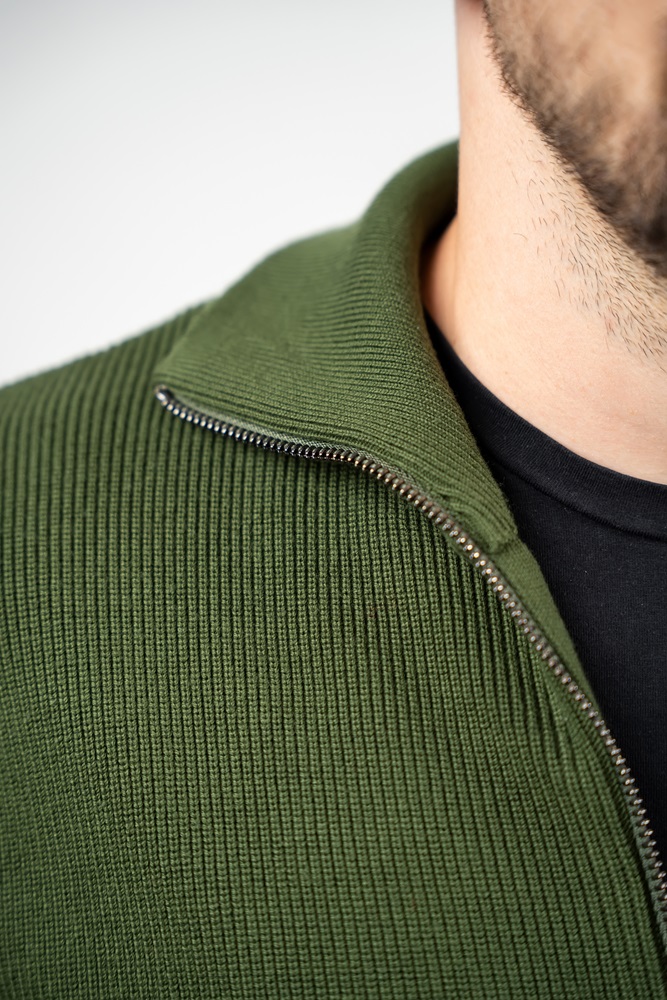 Pulover de culoare verde spanac cu guler pe gât și fermoar lung. Este fabricat din 50% bumbac 50% vâscoză.