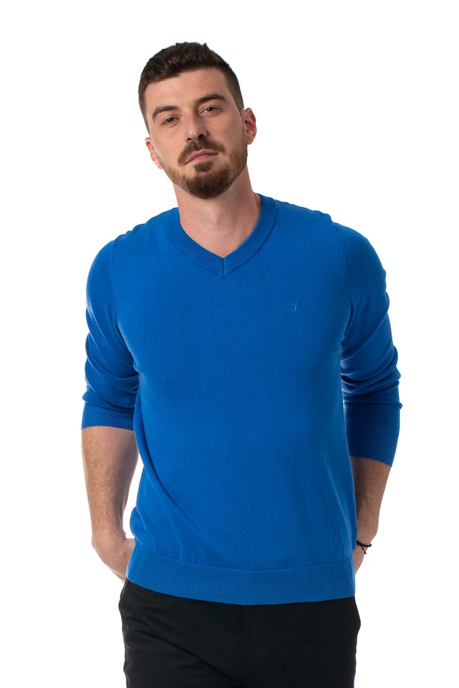 Pulover barbati albastru, confectionat din bumbac 100%. Se potriveste stilului clasic gratie simplitatii lui avand gulerul in forma de V si se asoreaza excelent la o pereche de jeans.