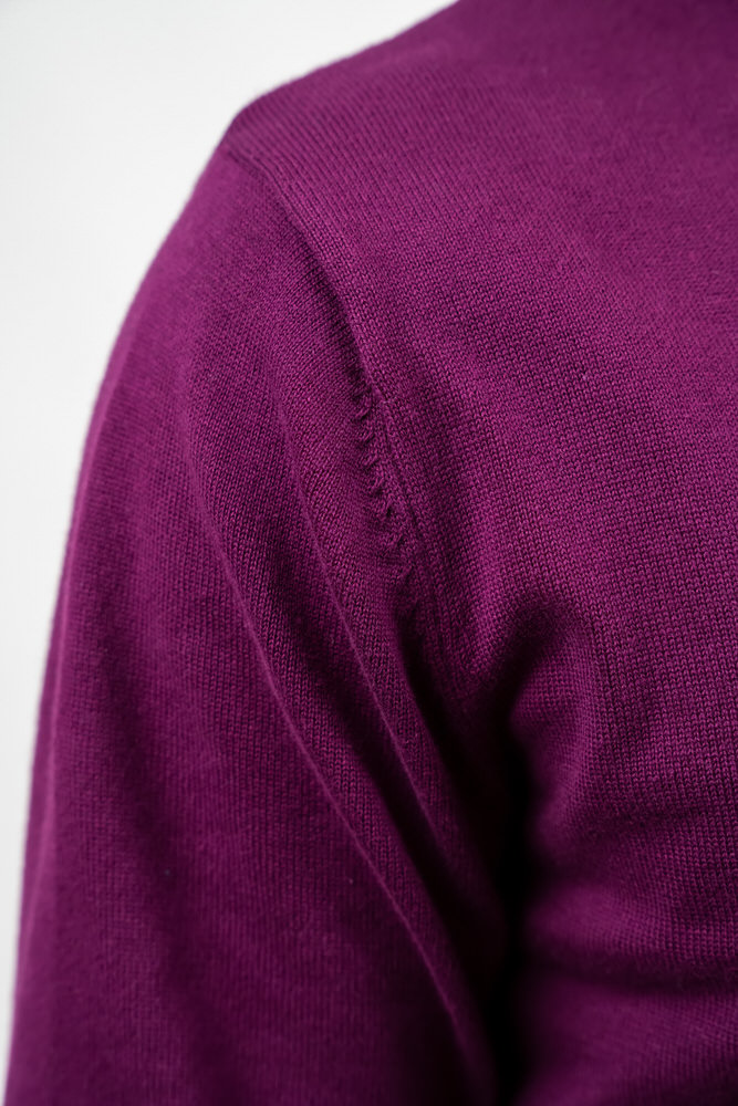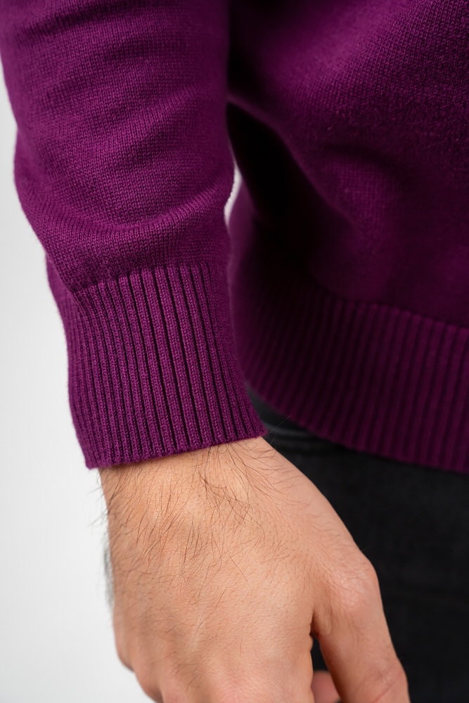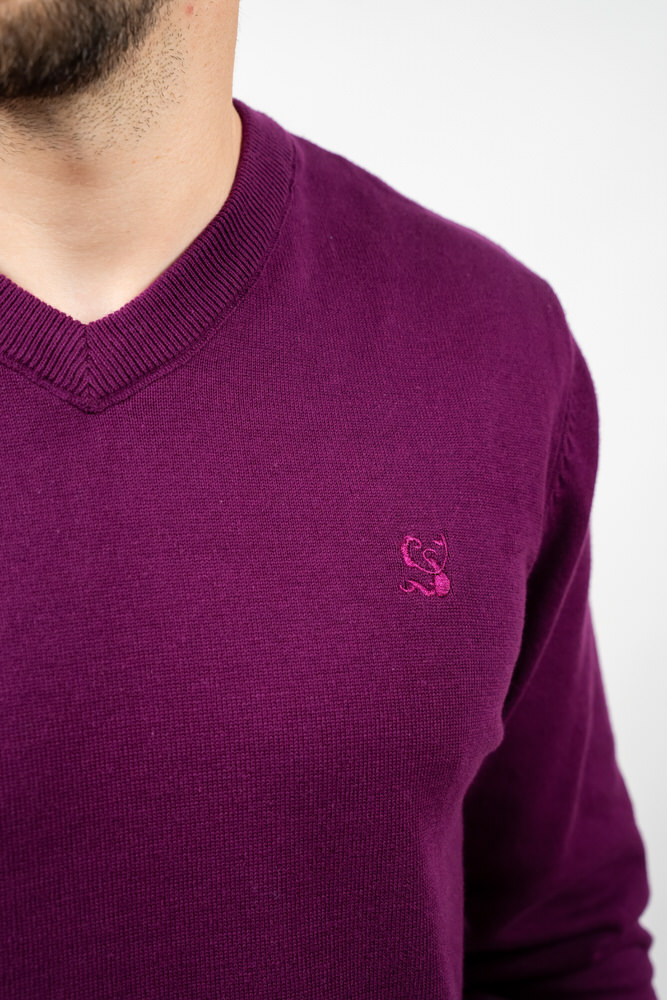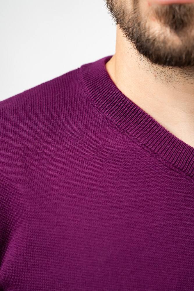Pulover de culoare purpura cu guler în V. Este fabricat din 98% bumbac 2% poliester.