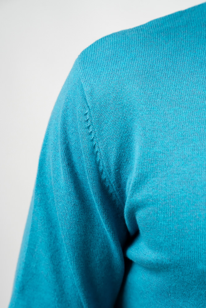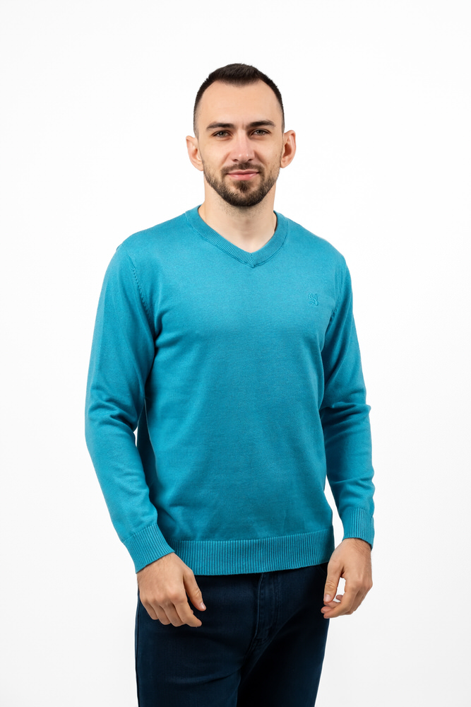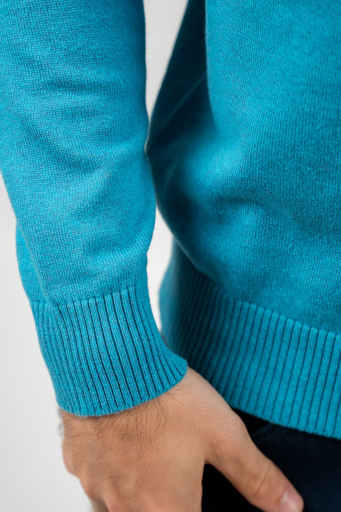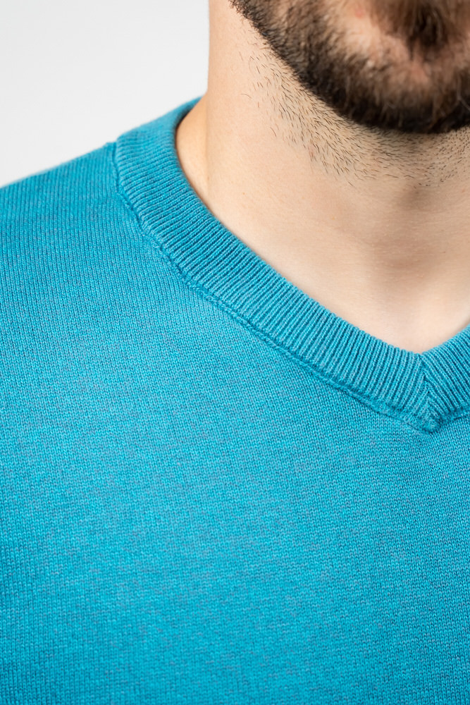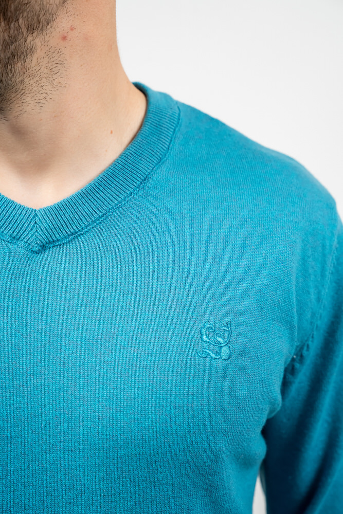 Pulover de culoare albastru canar cu guler în V. Este fabricat din 98% bumbac 2% poliester.