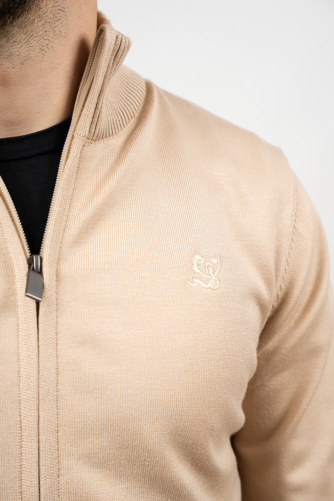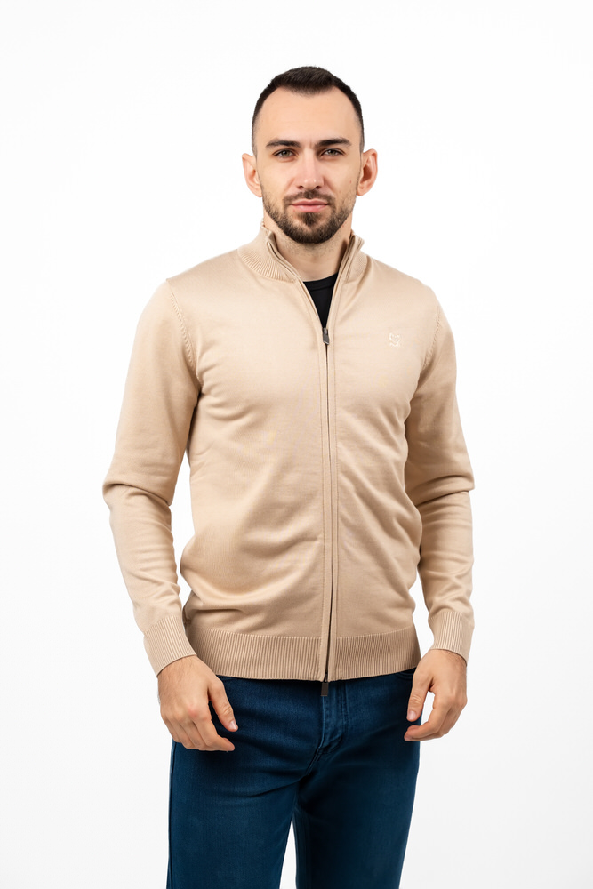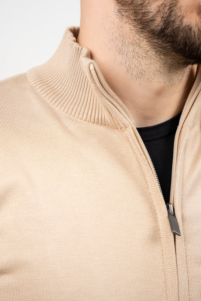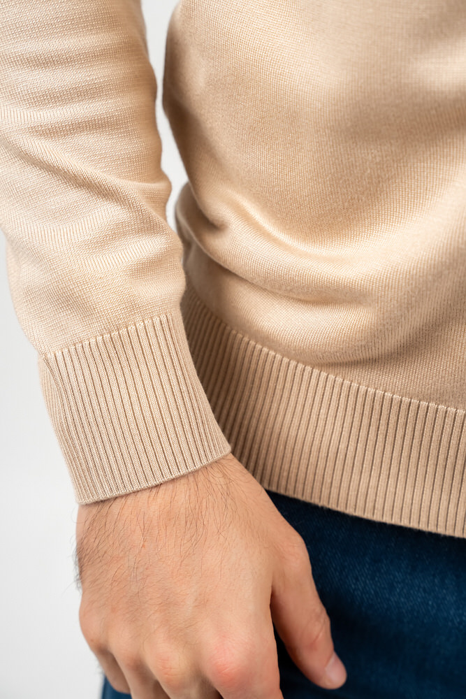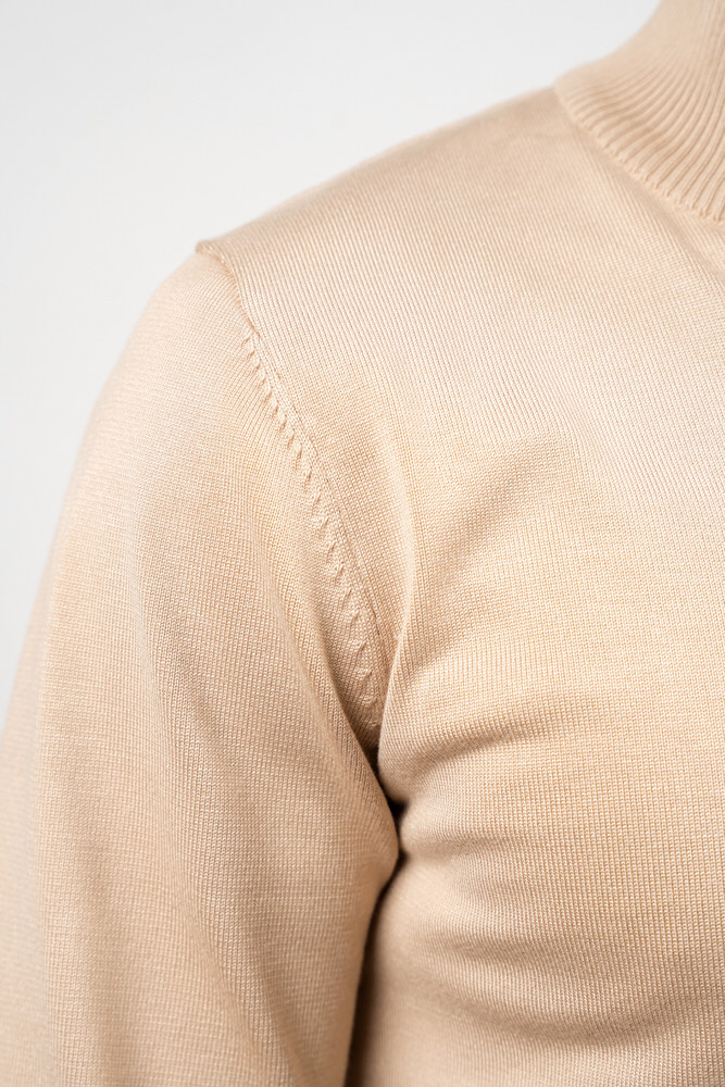 Pulover de culoare bej cu guler pe gât și fermoar lung. Este fabricat din 50% bumbac 50% vâscoză.