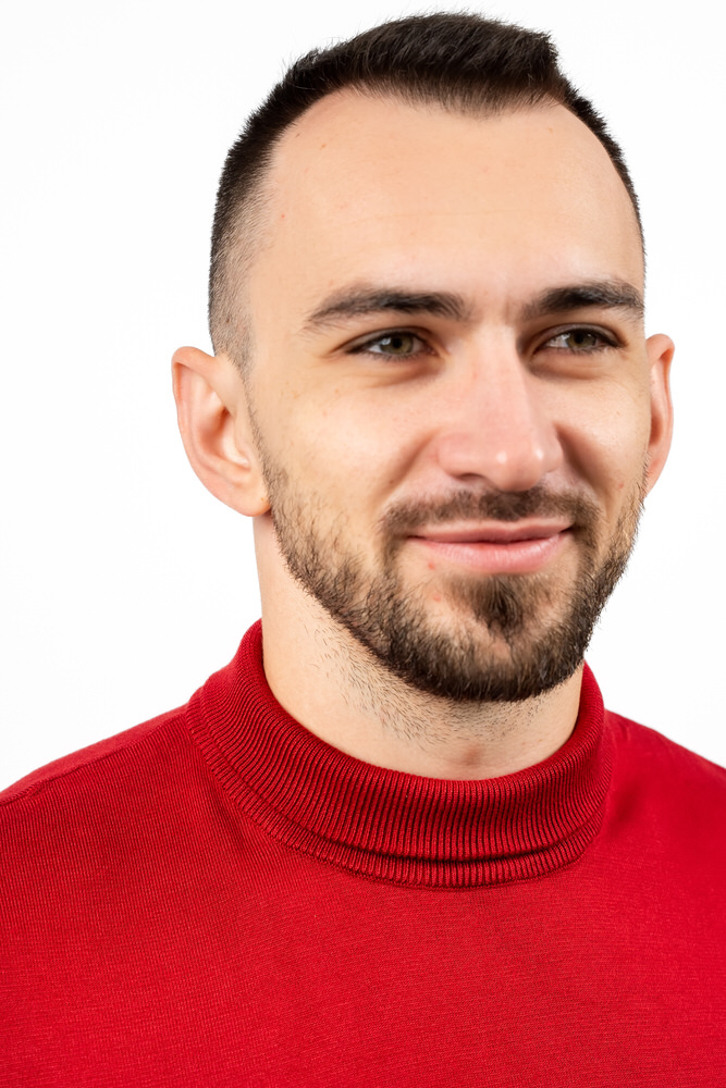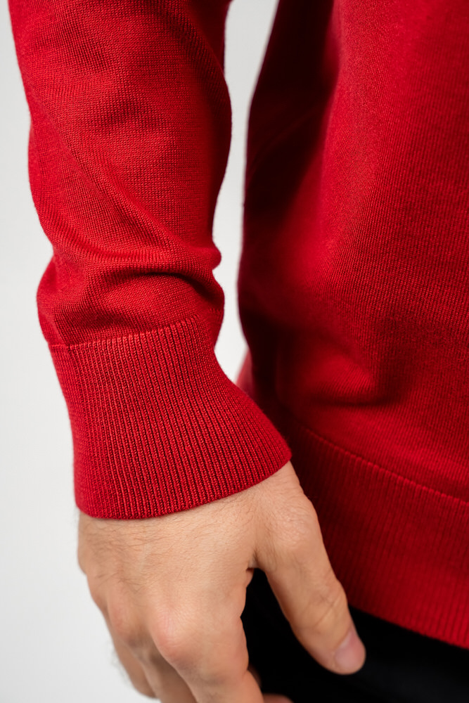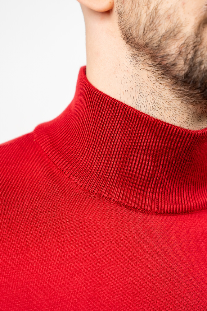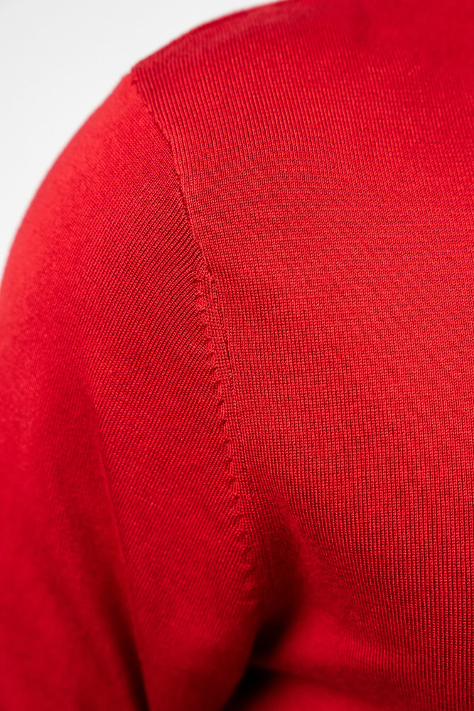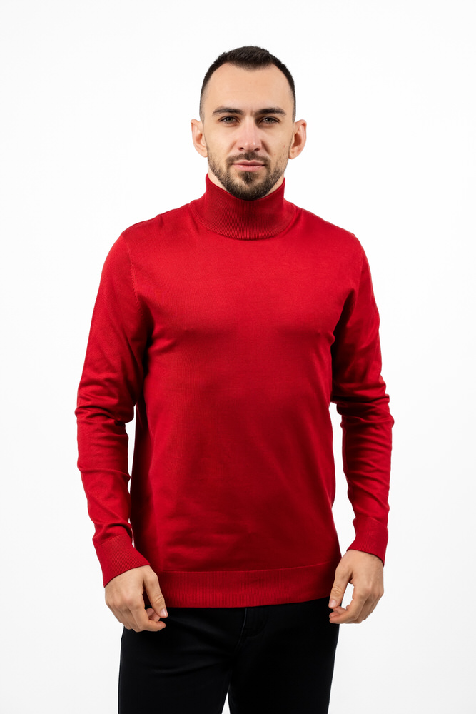 Pulover de culoare roșu cărămiziu cu guler pe gât. Este fabricat din 50% bumbac 50% vâscoză.
