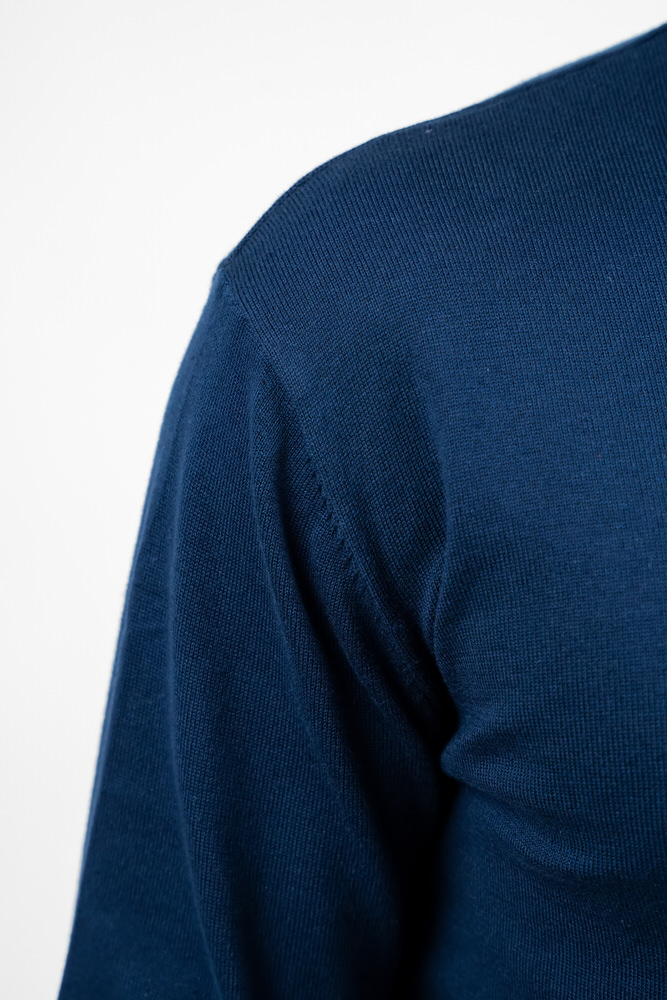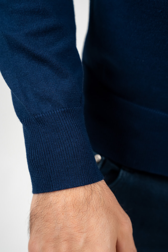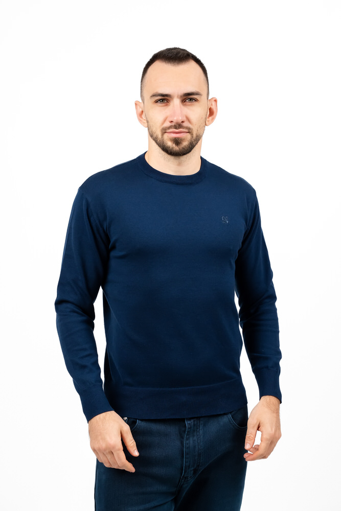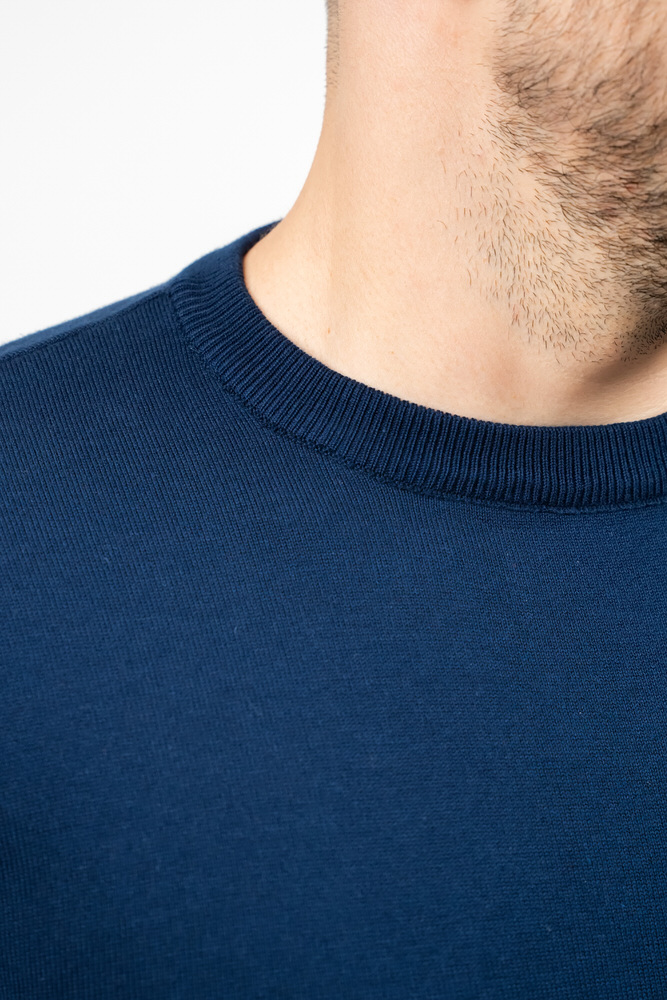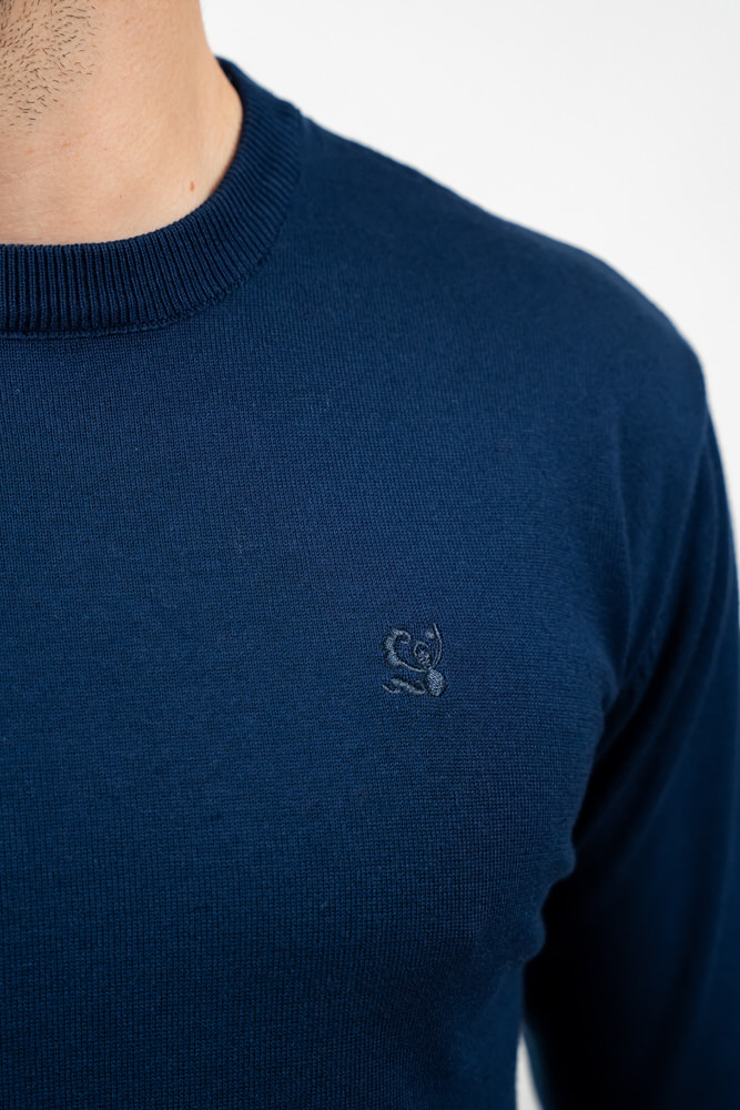 Pulover de culoare bleumarin cu guler rotund. Este fabricat din 100% bumbac.